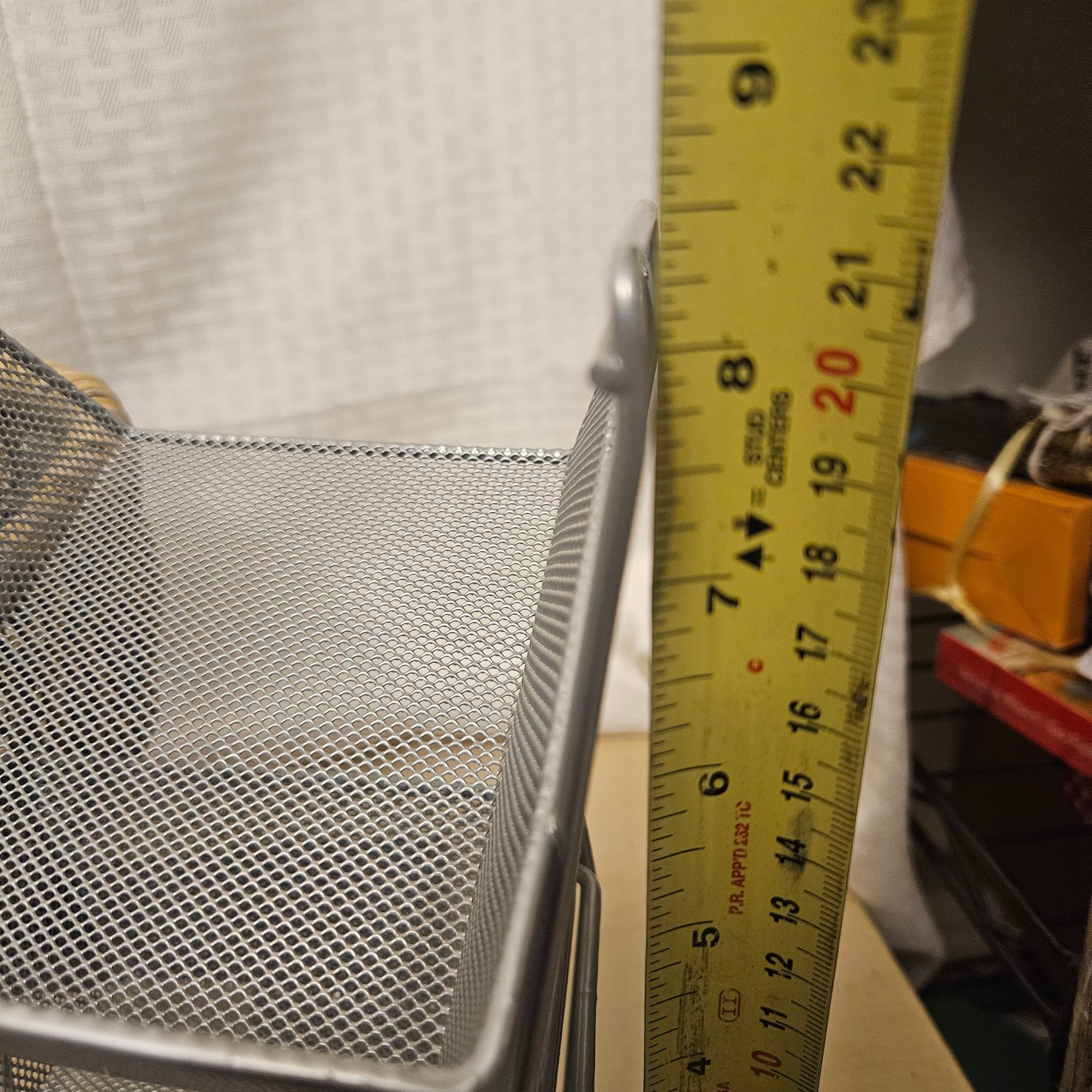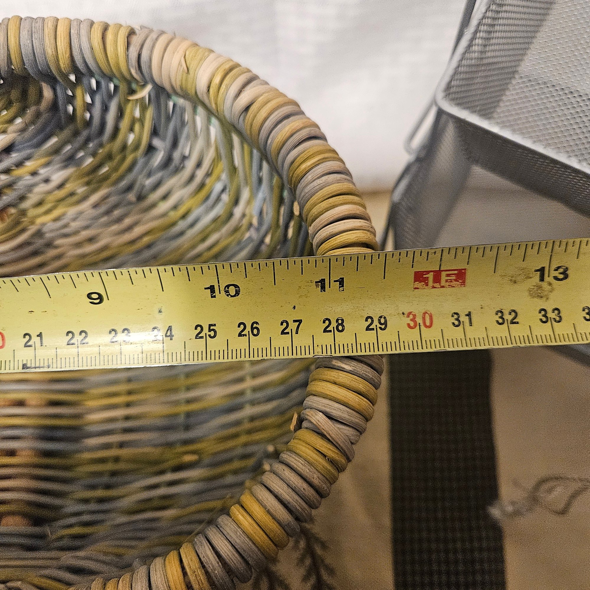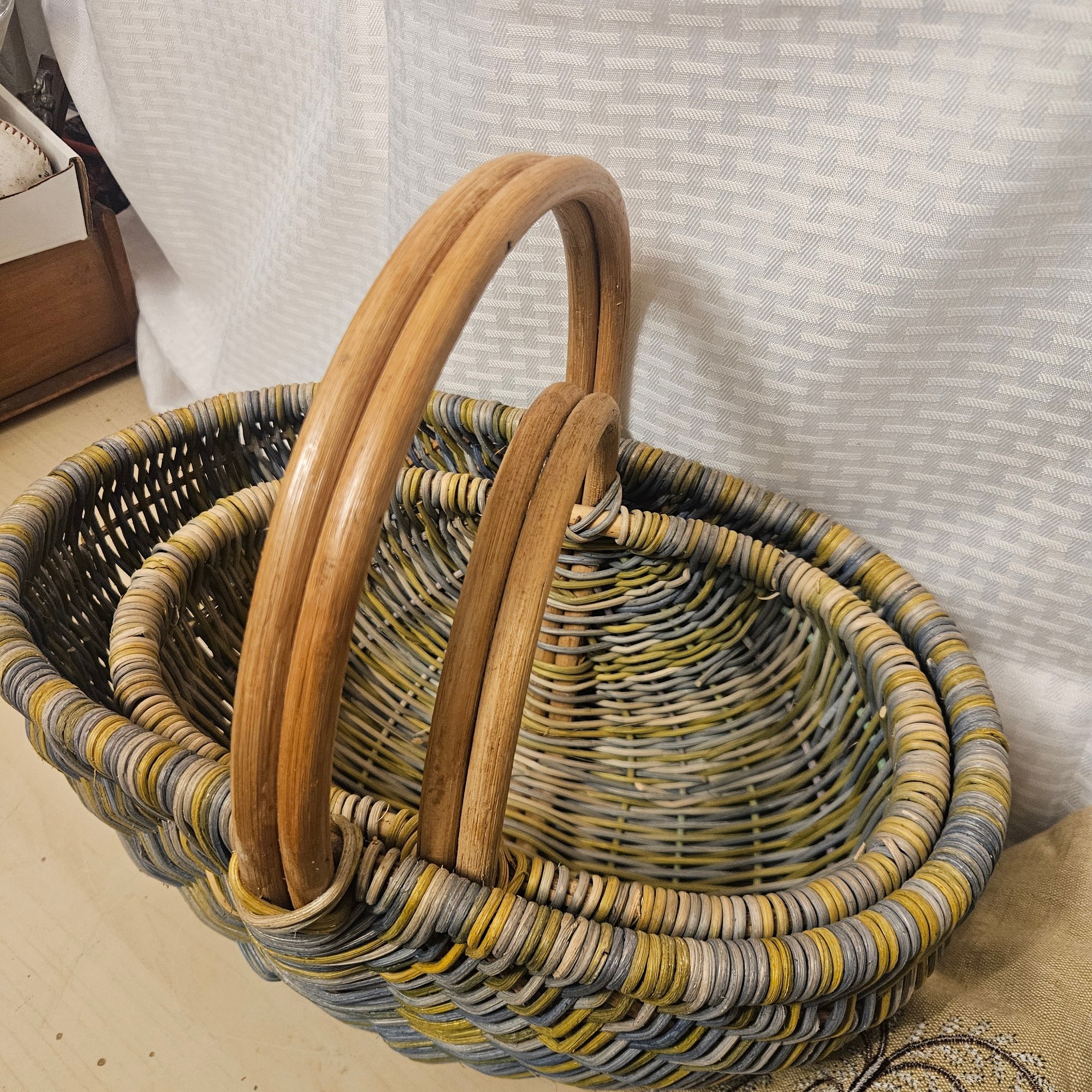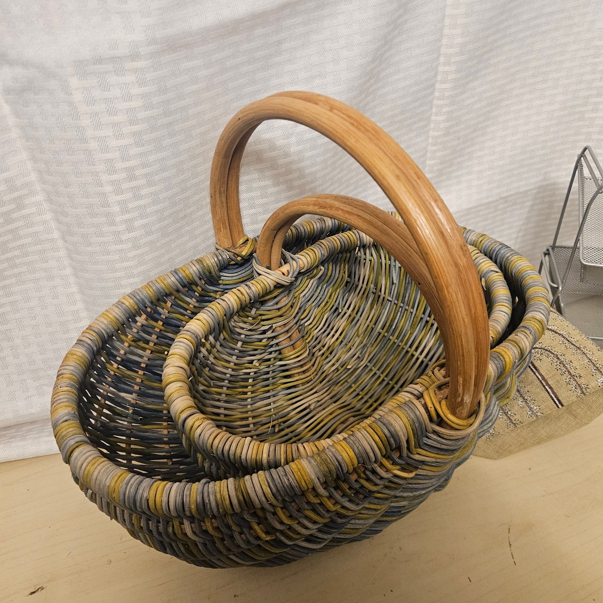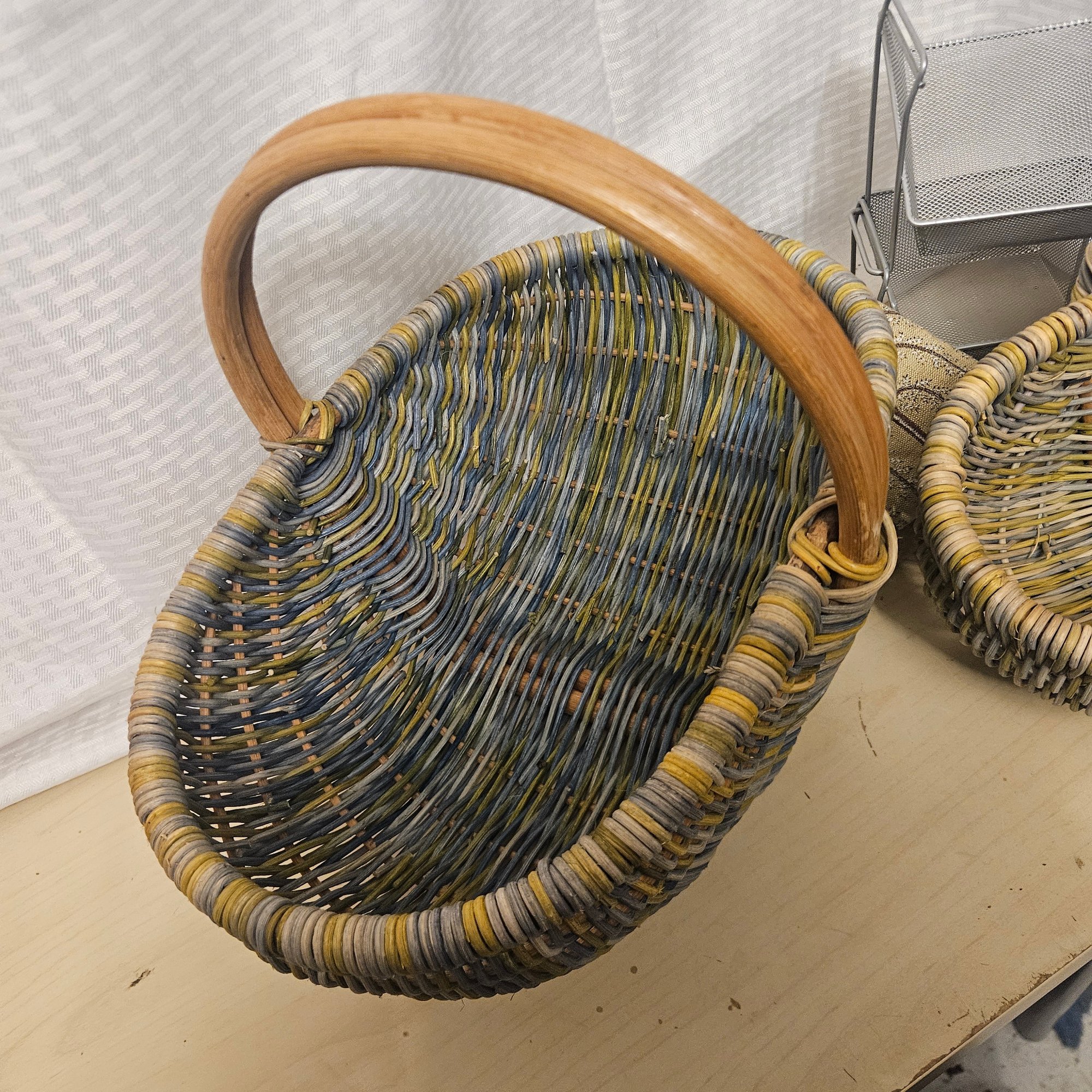 This useful and stylish lot includes two wooden baskets with a warm rustic charm, two metal stacking storage containers ideal for organizing a variety of household items, and one coordinating mat to complete the set. Blending natural wood with durable metal, this versatile group is perfect for adding both function and decorative appeal to a kitchen, entryway, bathroom, or craft space. A great organization solution with timeless style.