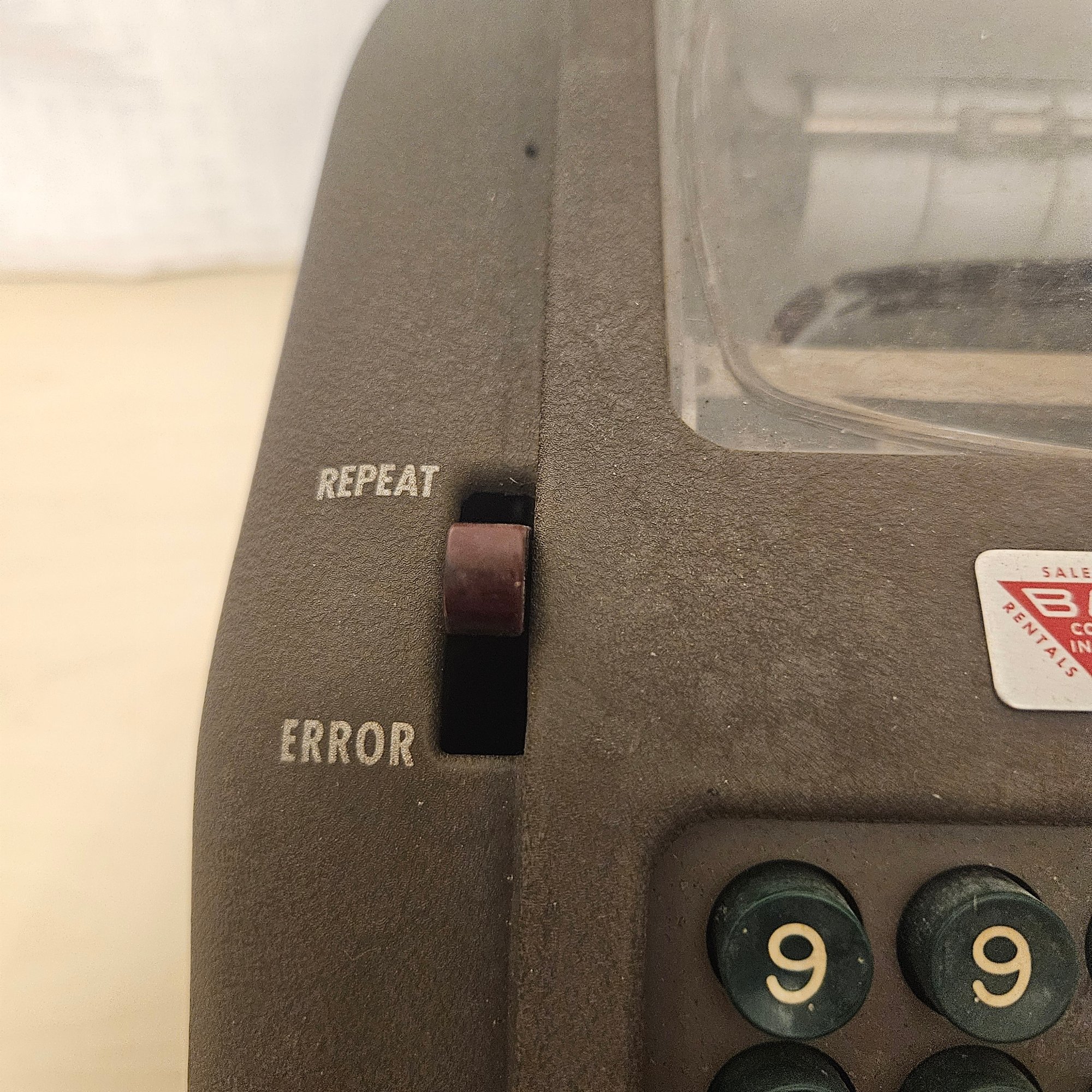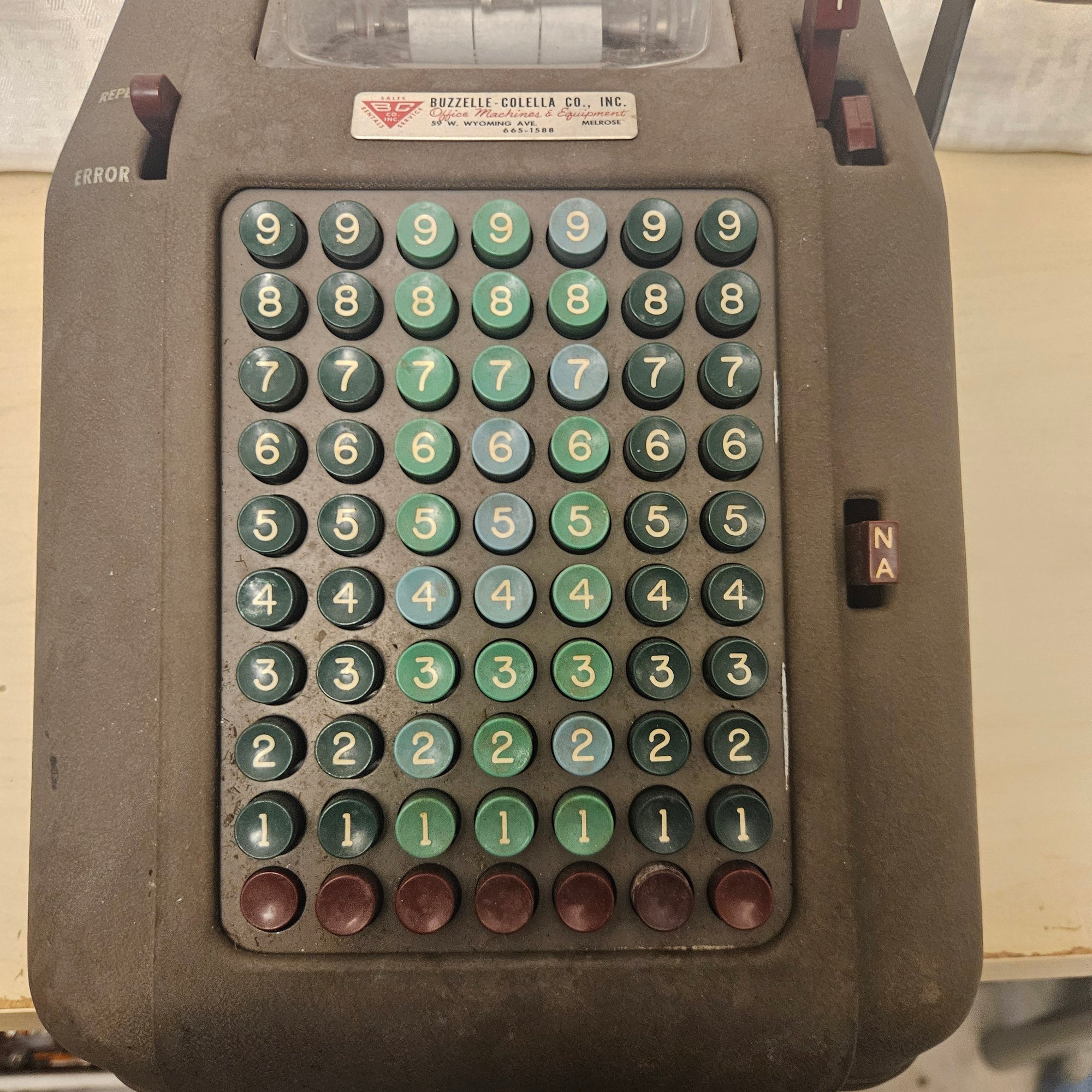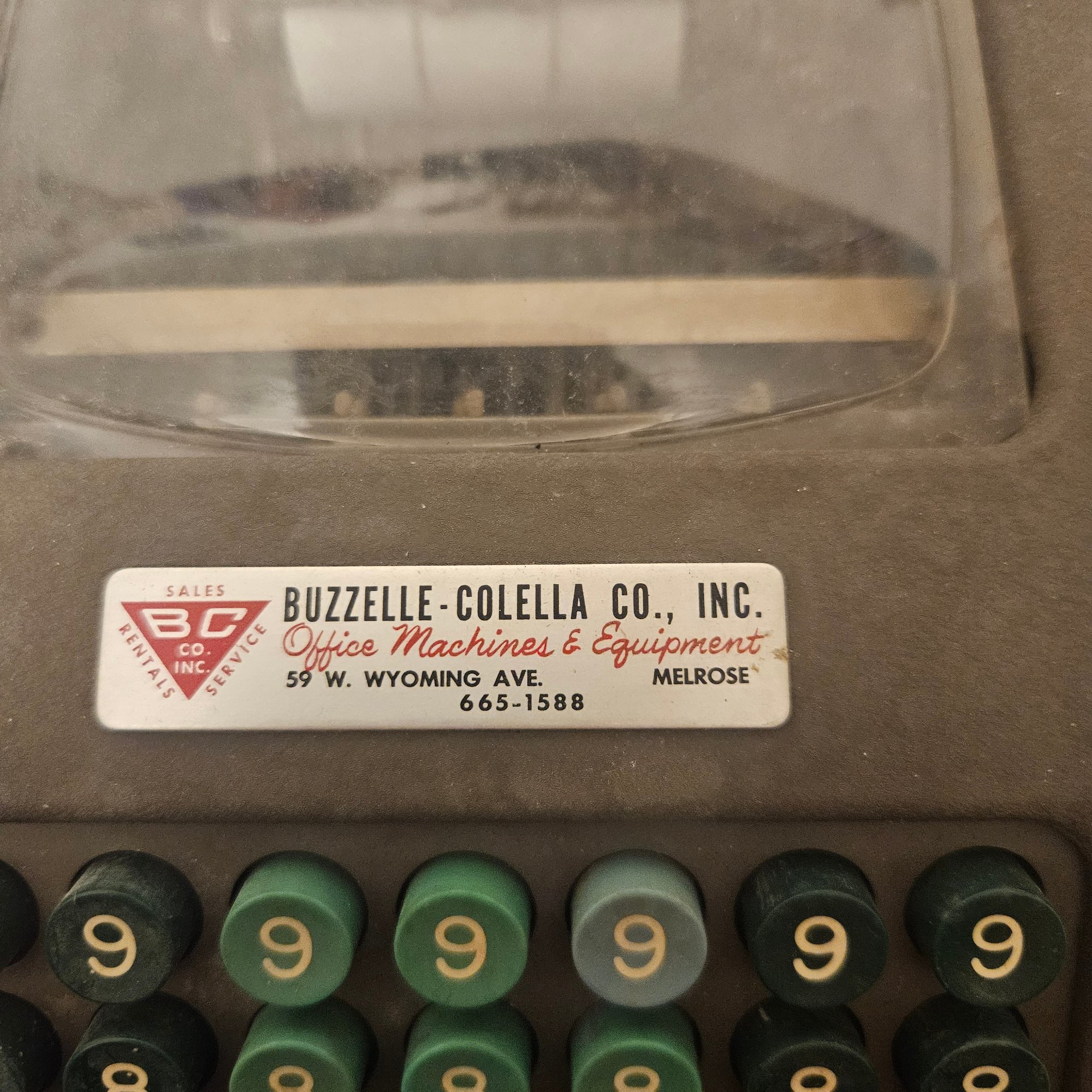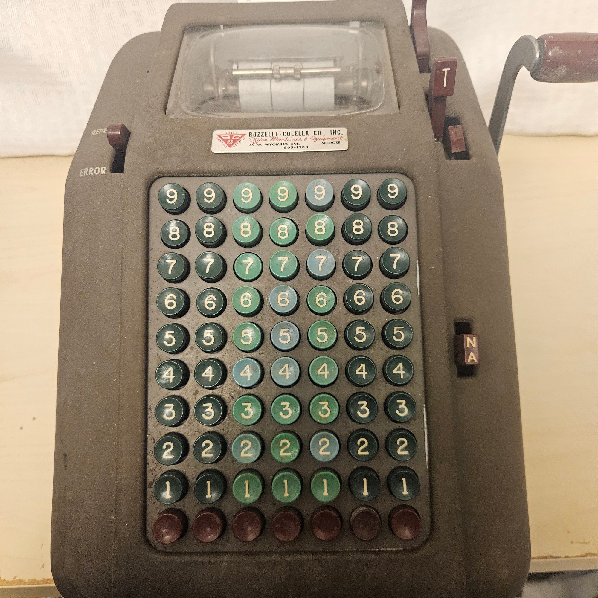 This rare and collectible lot features an old receipt machine from Buzzelle Colella Co. Inc., showcasing vintage office equipment craftsmanship. Perfect for collectors of antique tools, office memorabilia, or industrial décor enthusiasts, this piece adds historical charm and a unique conversation starter to any collection or display.