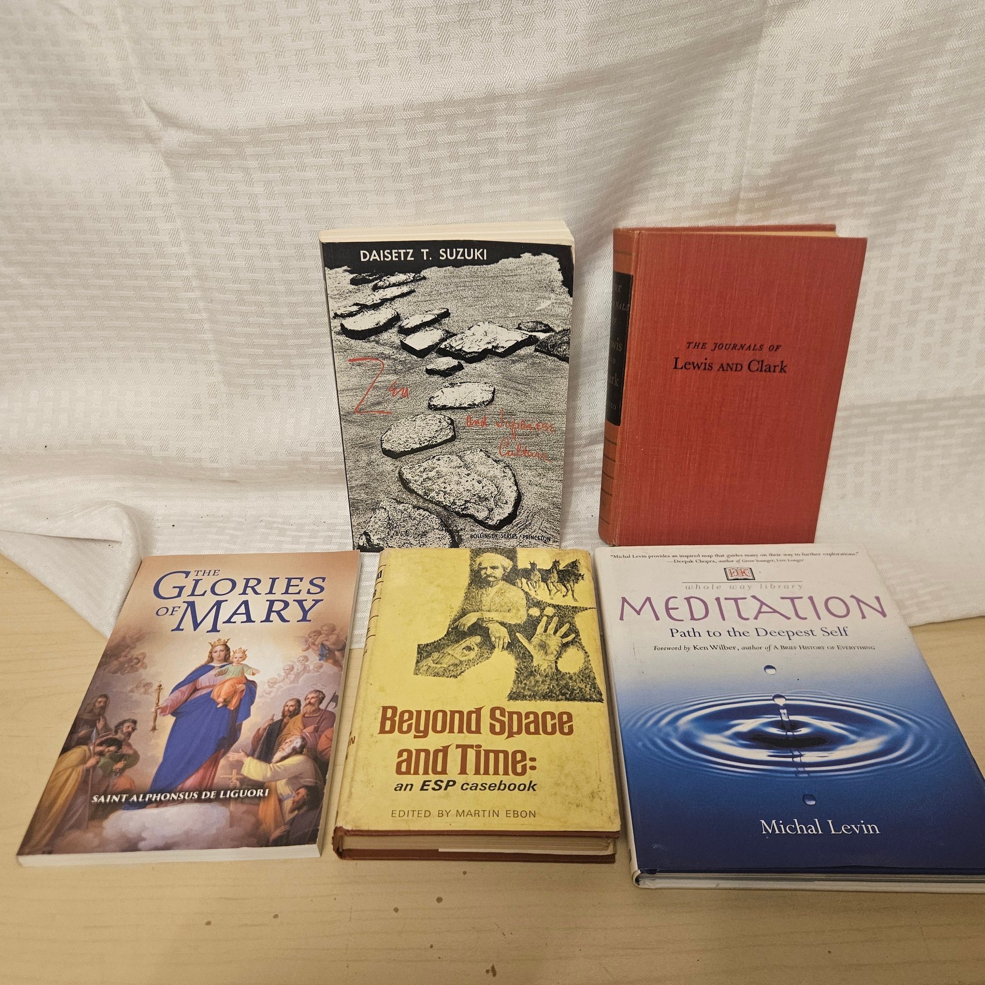 This diverse lot includes five collectible old books, featuring titles such as Lewis and Clark, a book about Mary, a meditation guide, Beyond Space and Time: An ESP Casebook, and additional assorted works. Blending history, spirituality, self-reflection, and paranormal exploration, this collection offers something for readers and collectors with varied interests. Ideal for a home library, display, or anyone who enjoys unique and thought-provoking vintage books.