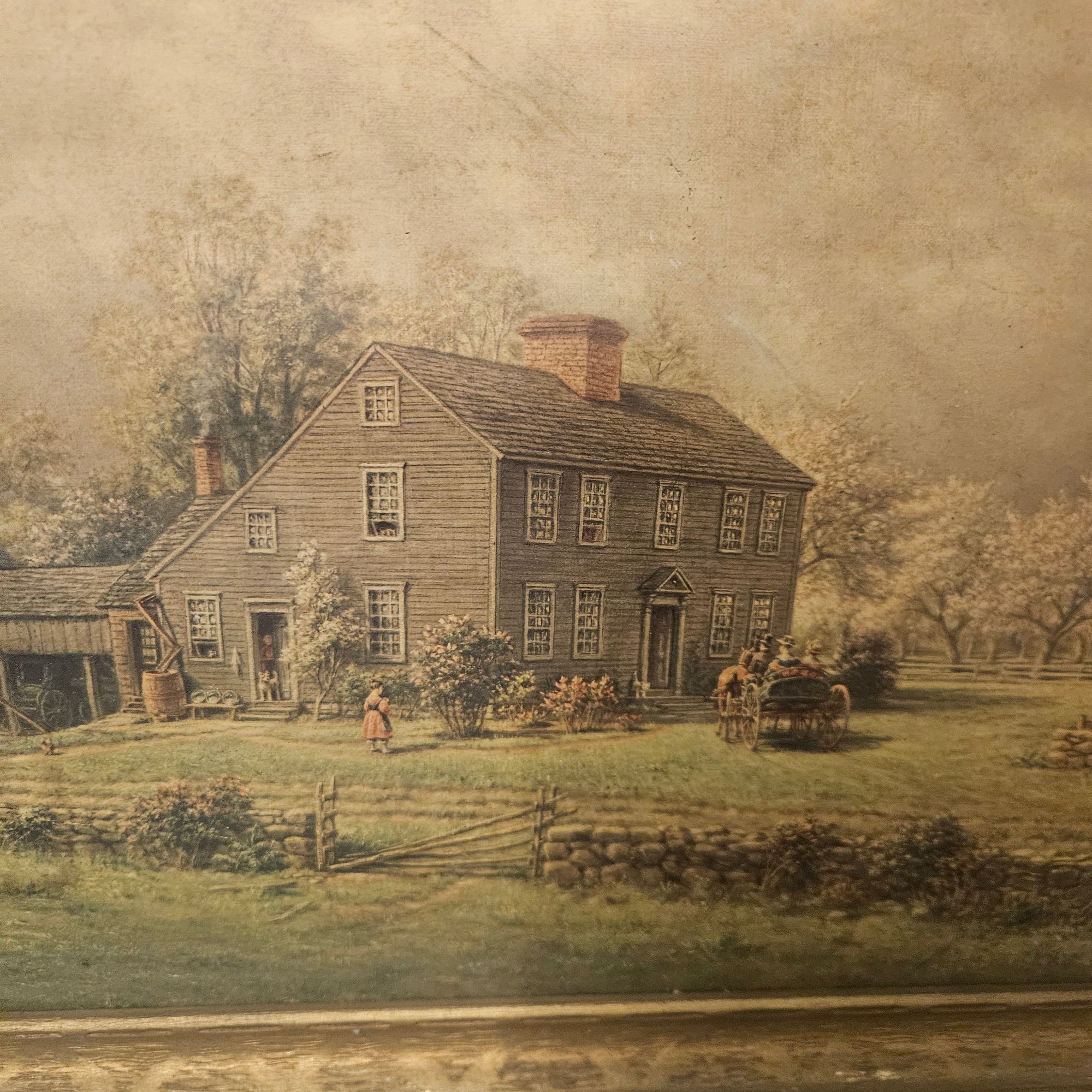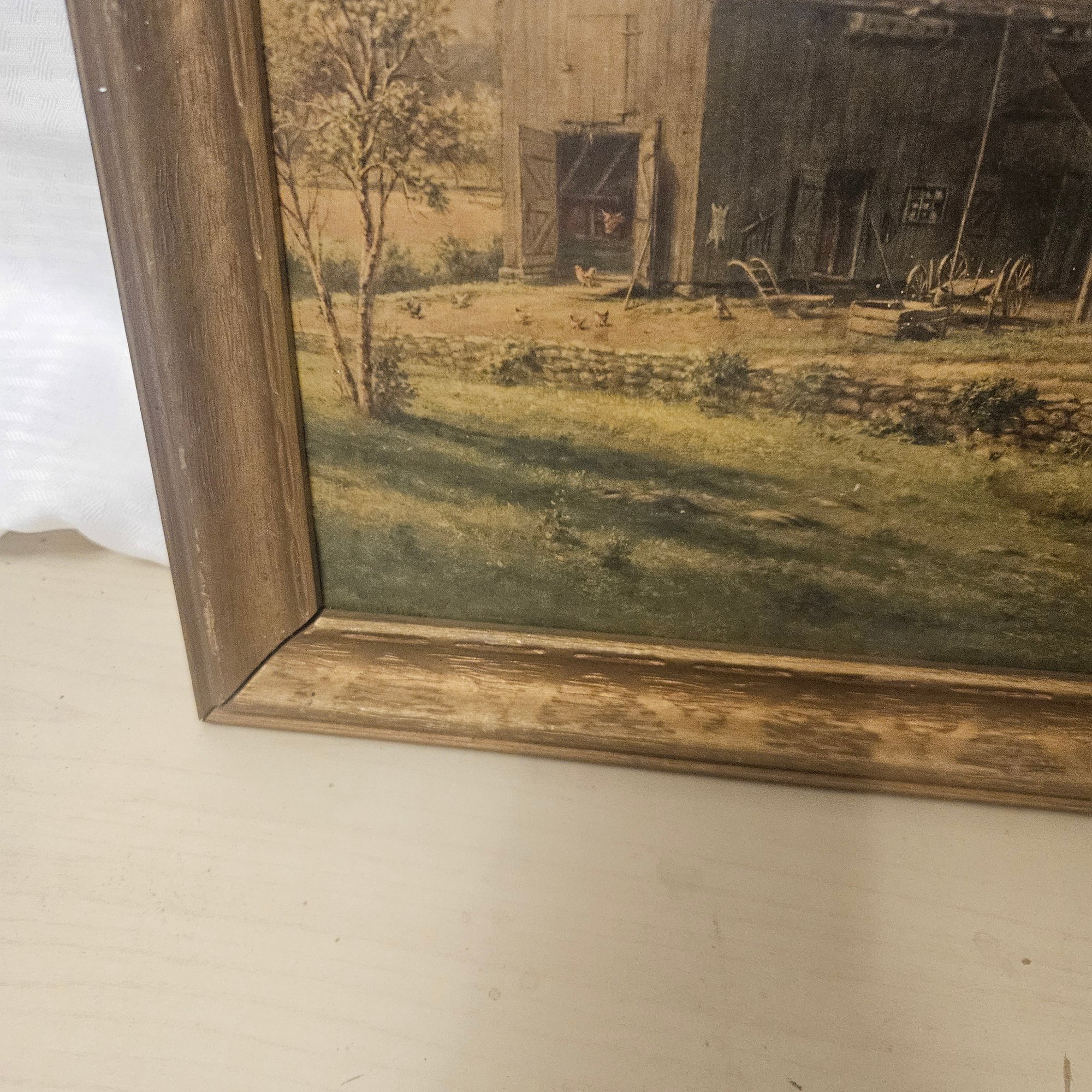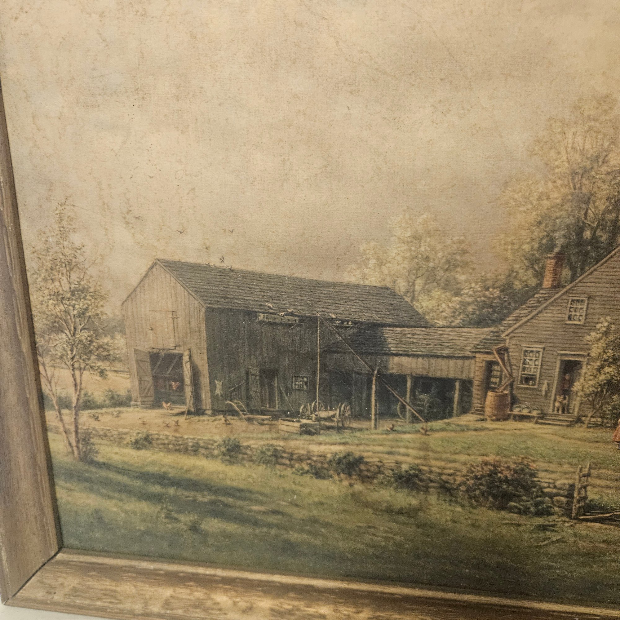 This old collectible features a framed image depicting a classic farm and house scene, capturing rustic charm and nostalgic appeal. Perfect for home or office décor, this piece adds a touch of country life and timeless character to any space. Ideal for collectors of vintage artwork or anyone who appreciates serene and pastoral imagery.
