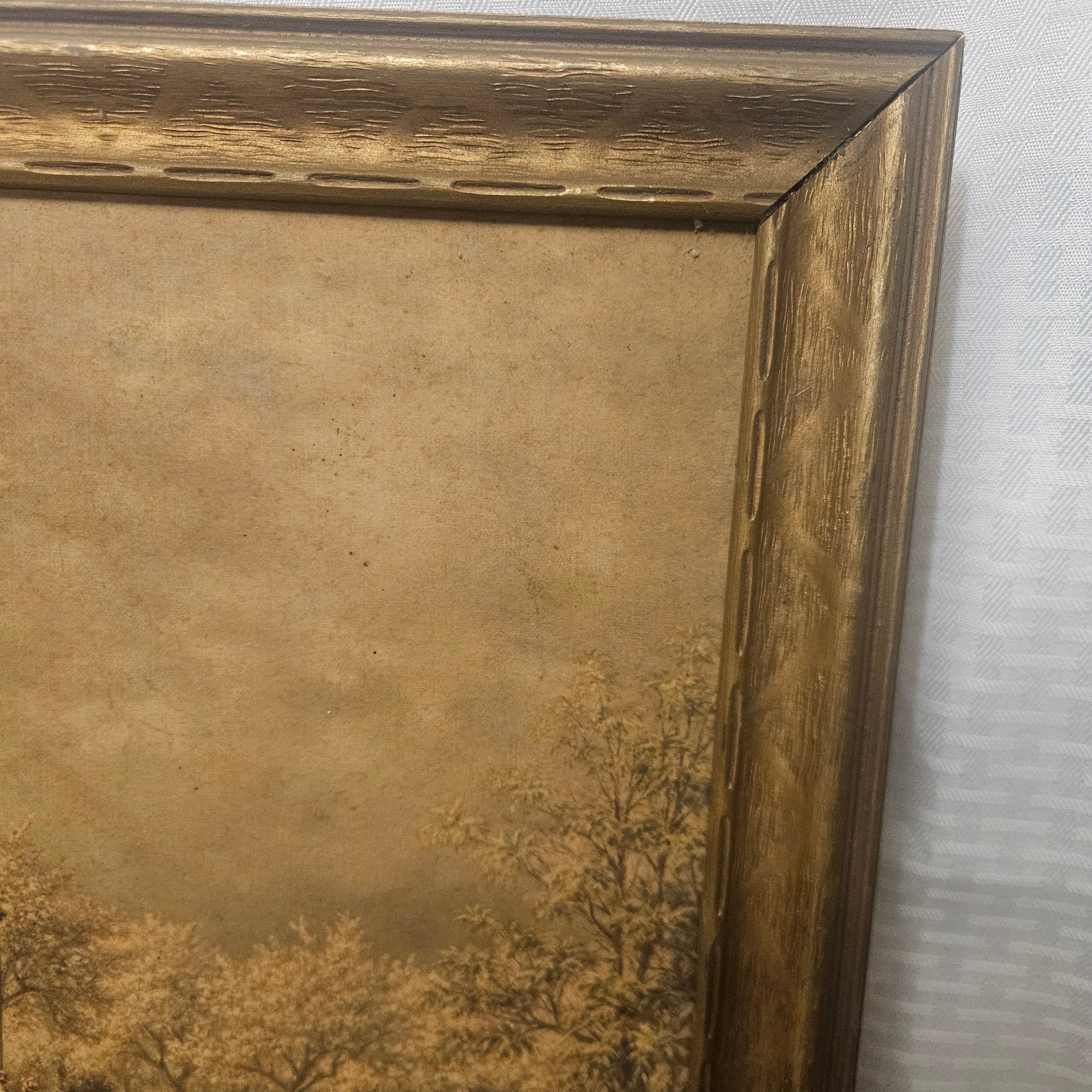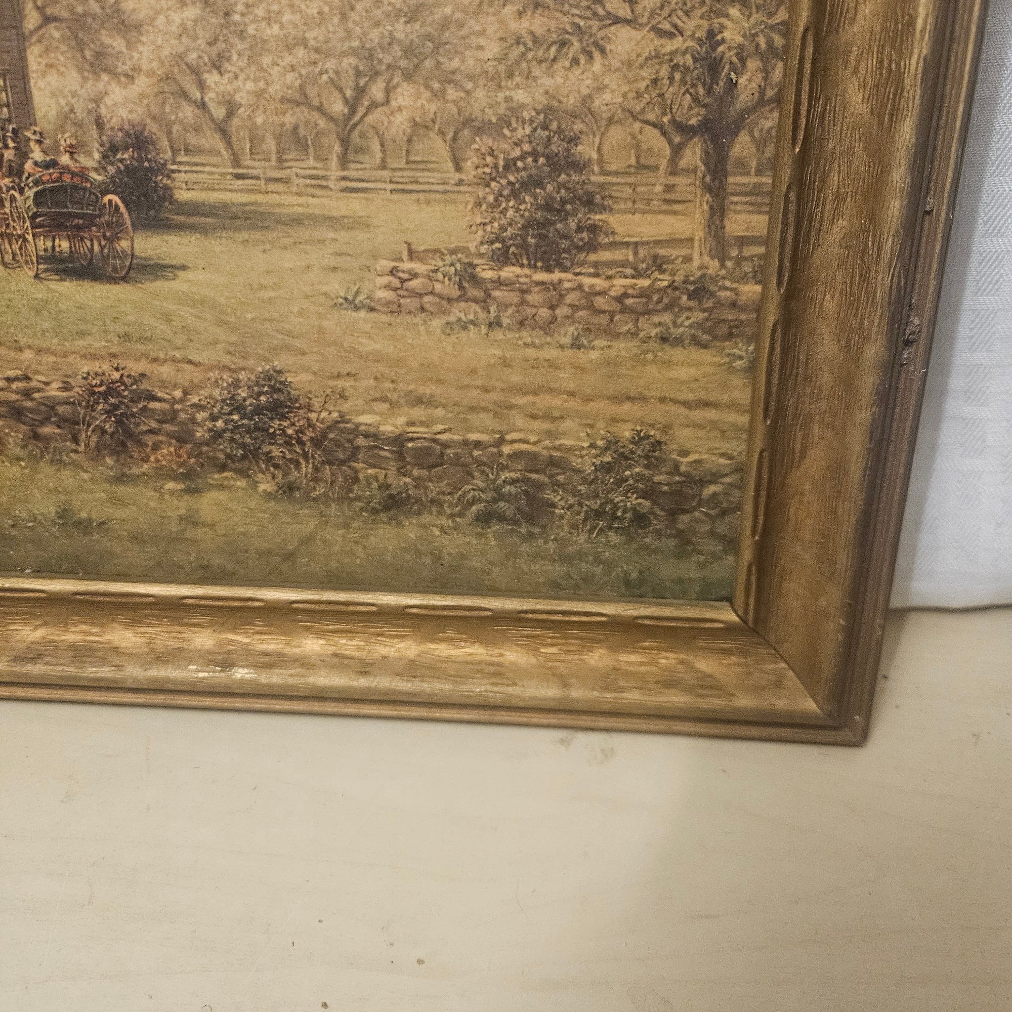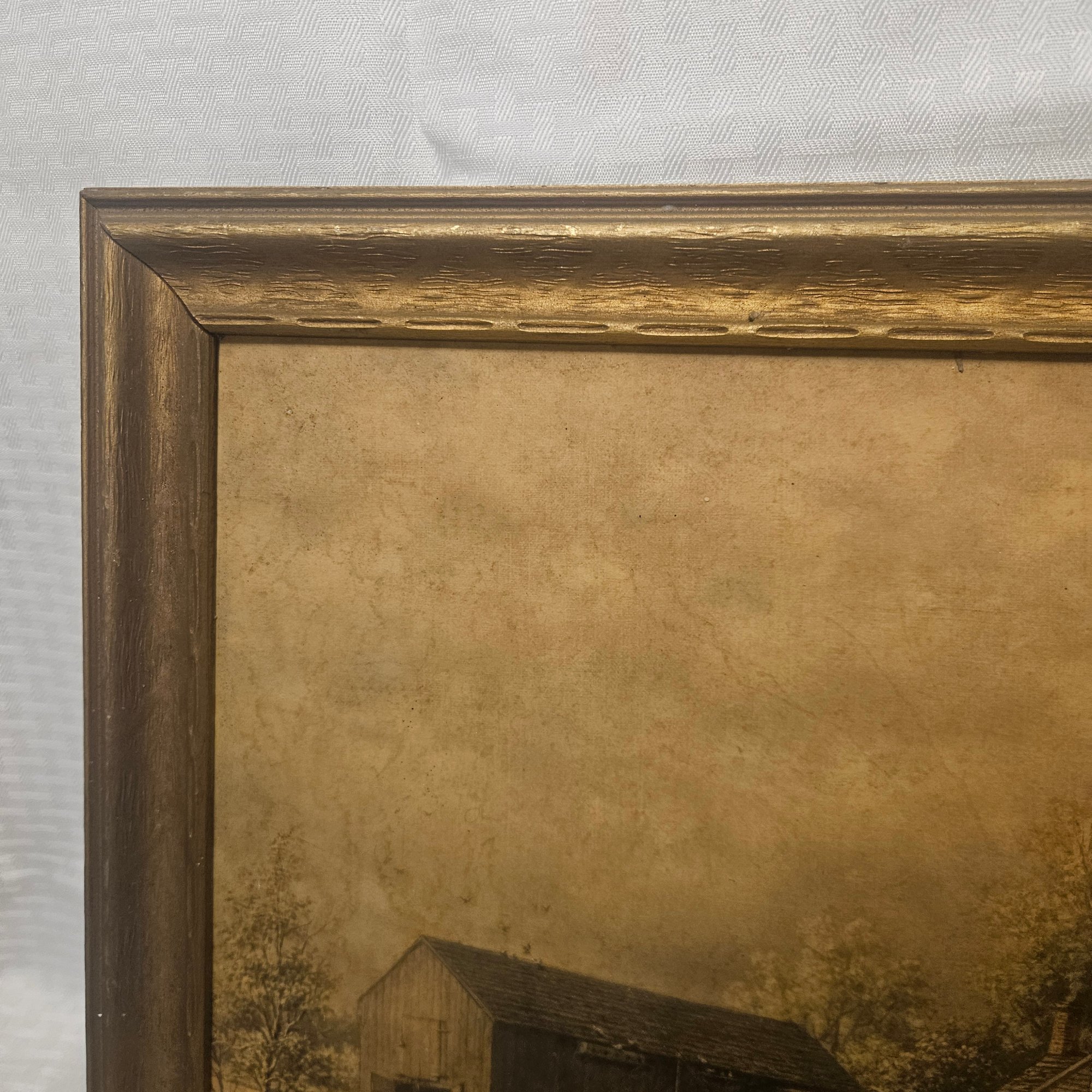 This old collectible features a framed image depicting a classic farm and house scene, capturing rustic charm and nostalgic appeal. Perfect for home or office décor, this piece adds a touch of country life and timeless character to any space. Ideal for collectors of vintage artwork or anyone who appreciates serene and pastoral imagery.