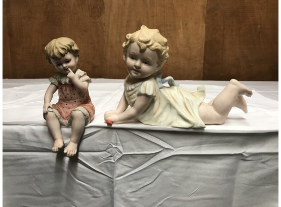 2 antique bisque piano babies. Larger one is 11” across. Both excellent condition. Larger one is marked 23/542, smalller unmarked. Probably German.