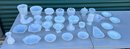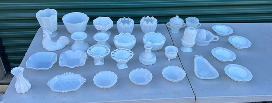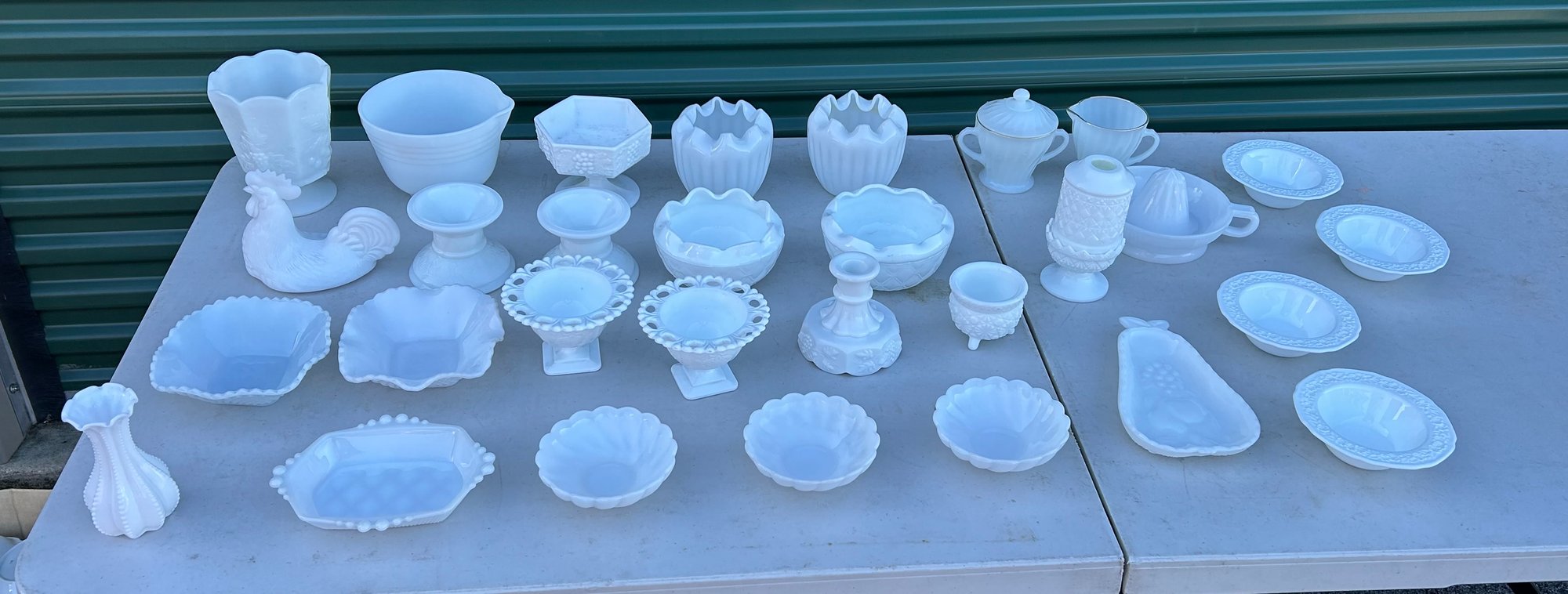 Very good condition. Various sizes and styles. Fire King sugar and creamer, Pyrex mixing bowl, vases, candlesticks and more.