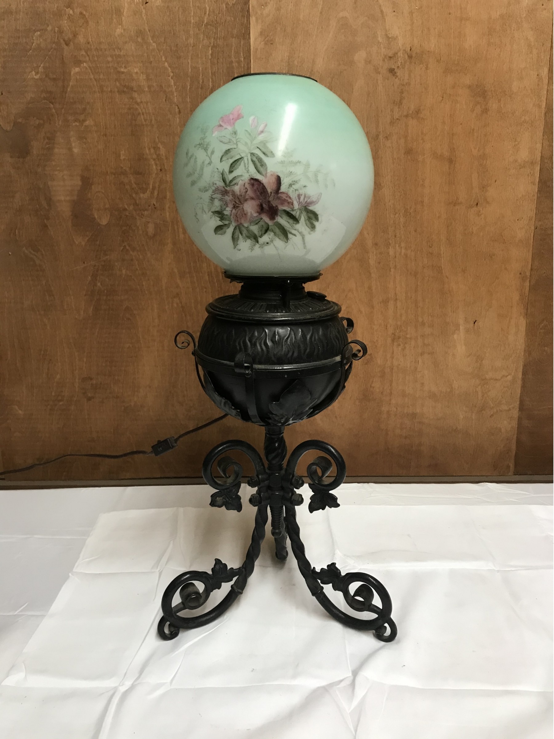 This is an antique Bradley & Hubbard kerosene lamp that has been converted to electricity. Wrought iron with a hand painted green glass shade. 24” tall, working condition.