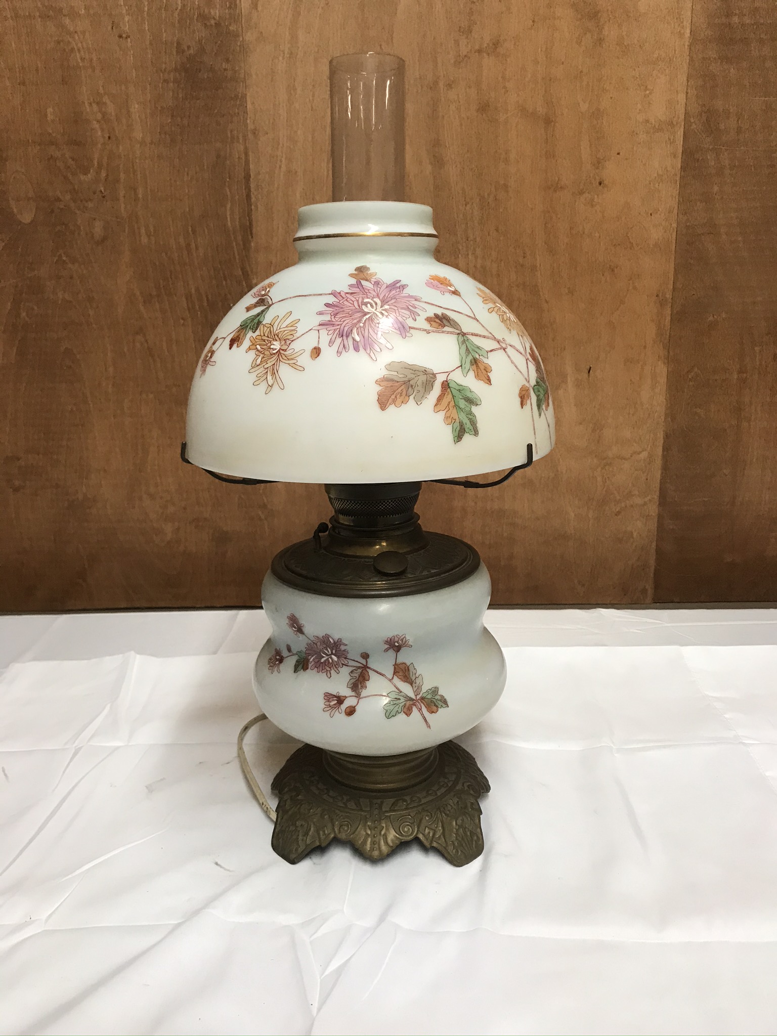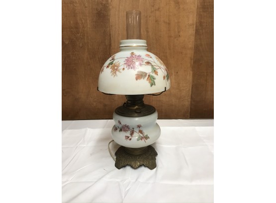 This lamp has been converted from kerosene to electric but is not working, may need rewiring. 21” tall. Glass has nice floral design. Good condition.