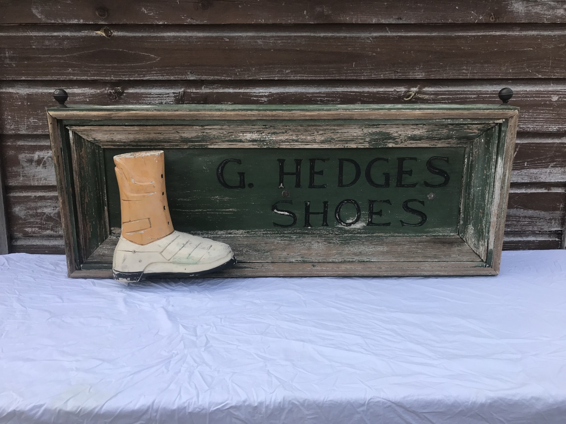 This is an antique folk art trade sign from G. Hedges Shoes. Weathered green paint with an attached shoe. Approximately 47” by 18” by 6”. Found in Massachusetts. Some wear to wood, paint loss.