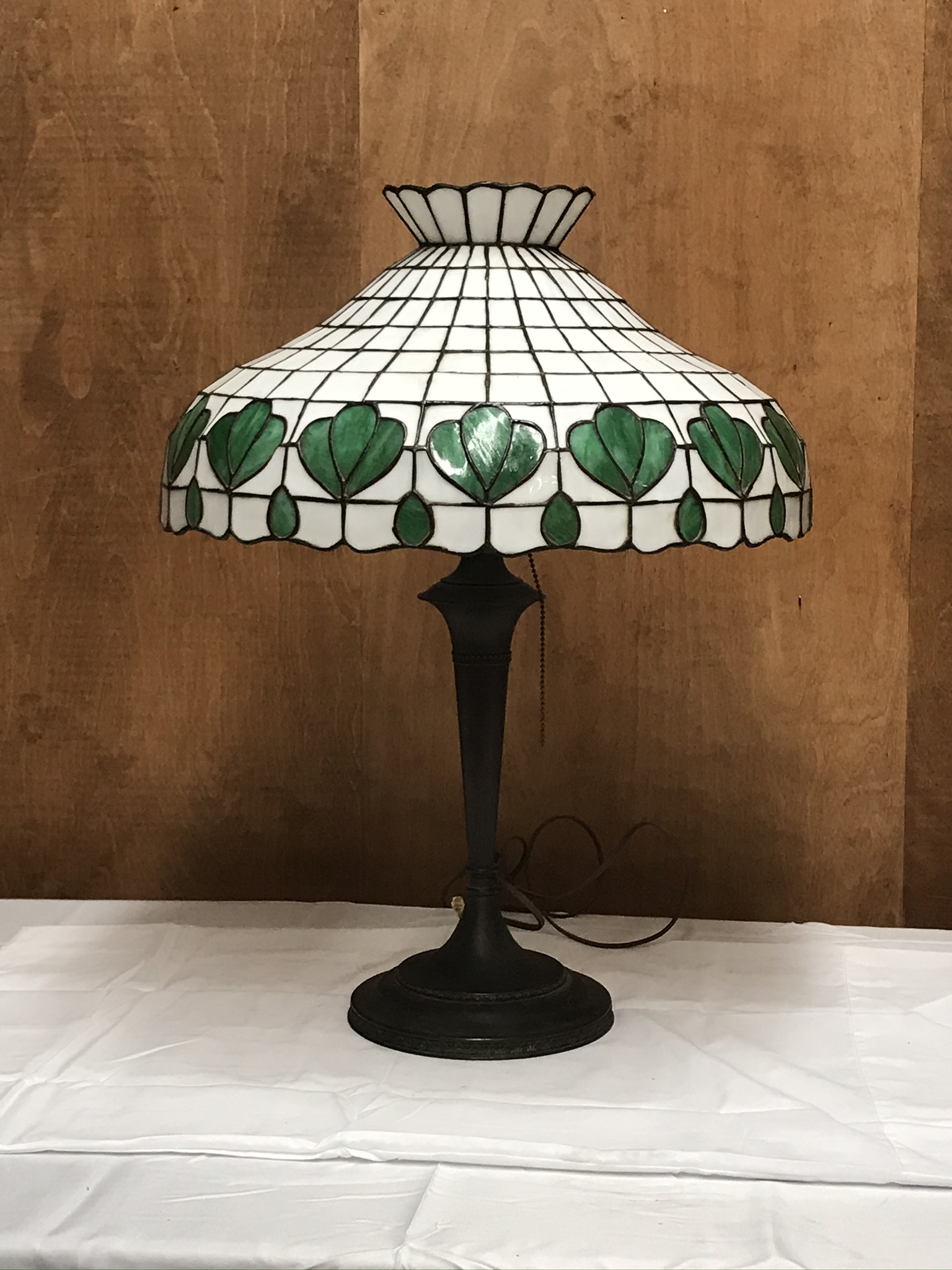 This is a beautiful antique lamp with an impressive white and green glass shade. 24” tall. Shade is 18” across. Needs rewiring, some cracks to glass.