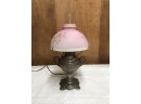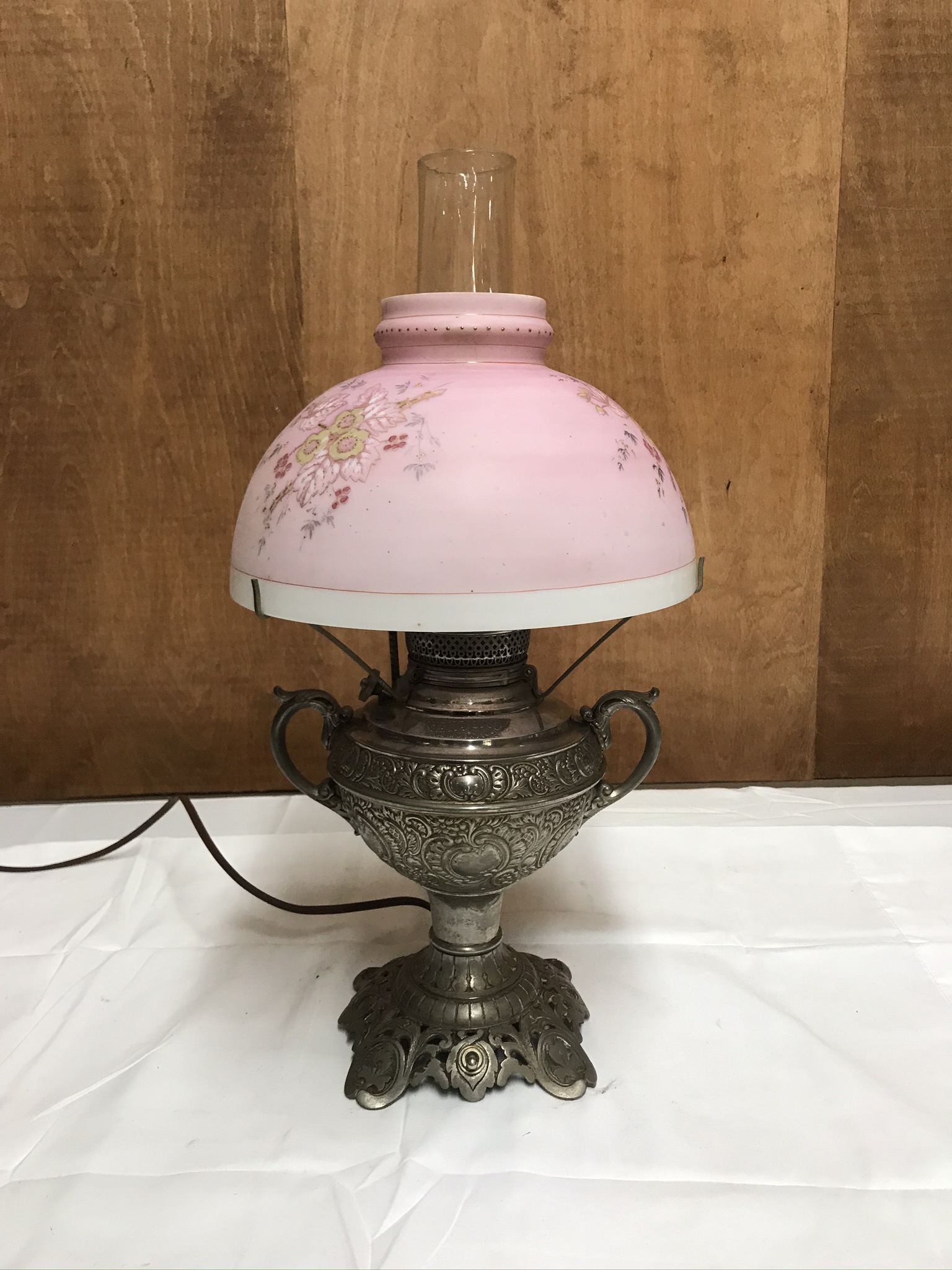 This is a New Juno #2 kerosene lamp that has been electrified. Very ornate metal base and a beautiful pink floral design on the shade. 20” tall. Excellent working condition.