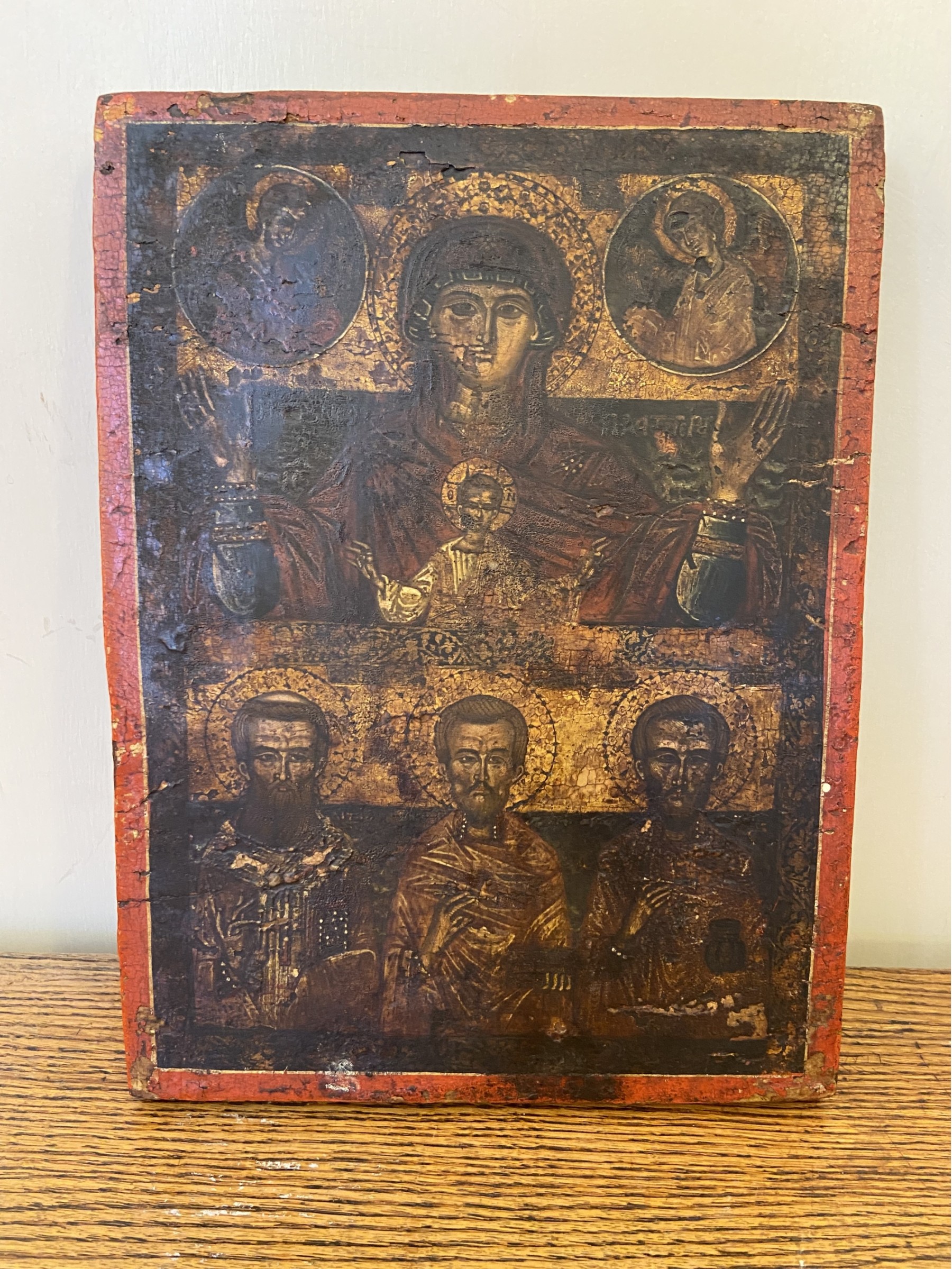 This icon is very old, I believe it is from no later than 19th century and may be even older. It is hand painted on a very old piece of wood, approximately 9” by 13”. The varnish has darkened and there is some paint loss. A beautiful piece to add to any collection.
