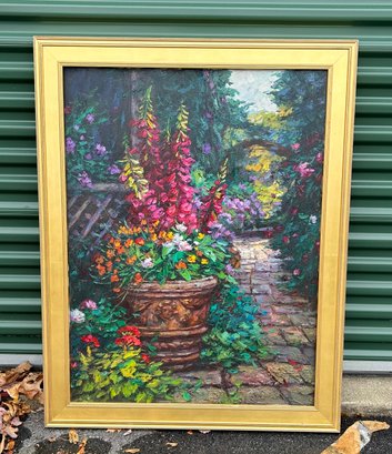 Very nice condition. 36” by 46”. Quality gold frame. Bright bold colors, signed “Young” I believe.