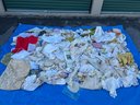 This is a massive collection of vintage linens including tablecloths, doilies, napkins, aprons, runners & much more. Highlights include a nice large lace tablecloth, new with tags Fruit of The Loom apron and a 10 yard