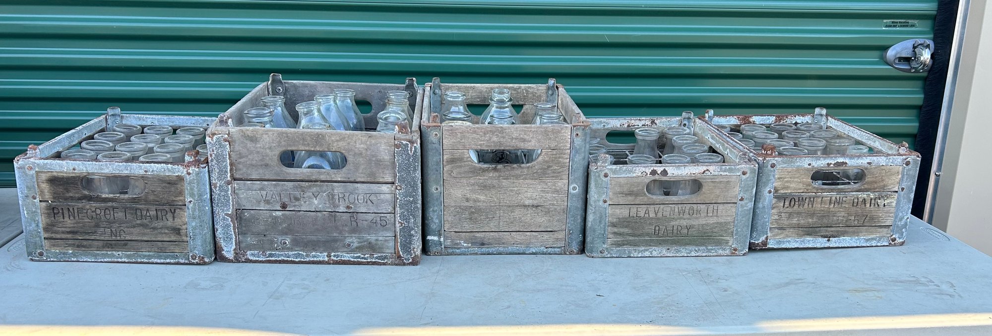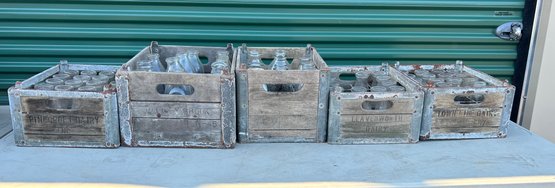 Various Dairies. Labeled and unlabeled bottles. Crates have rust and wear. Bottles are dirty and may have chips or wear but are generally intact. Great lot for a reseller or collector.