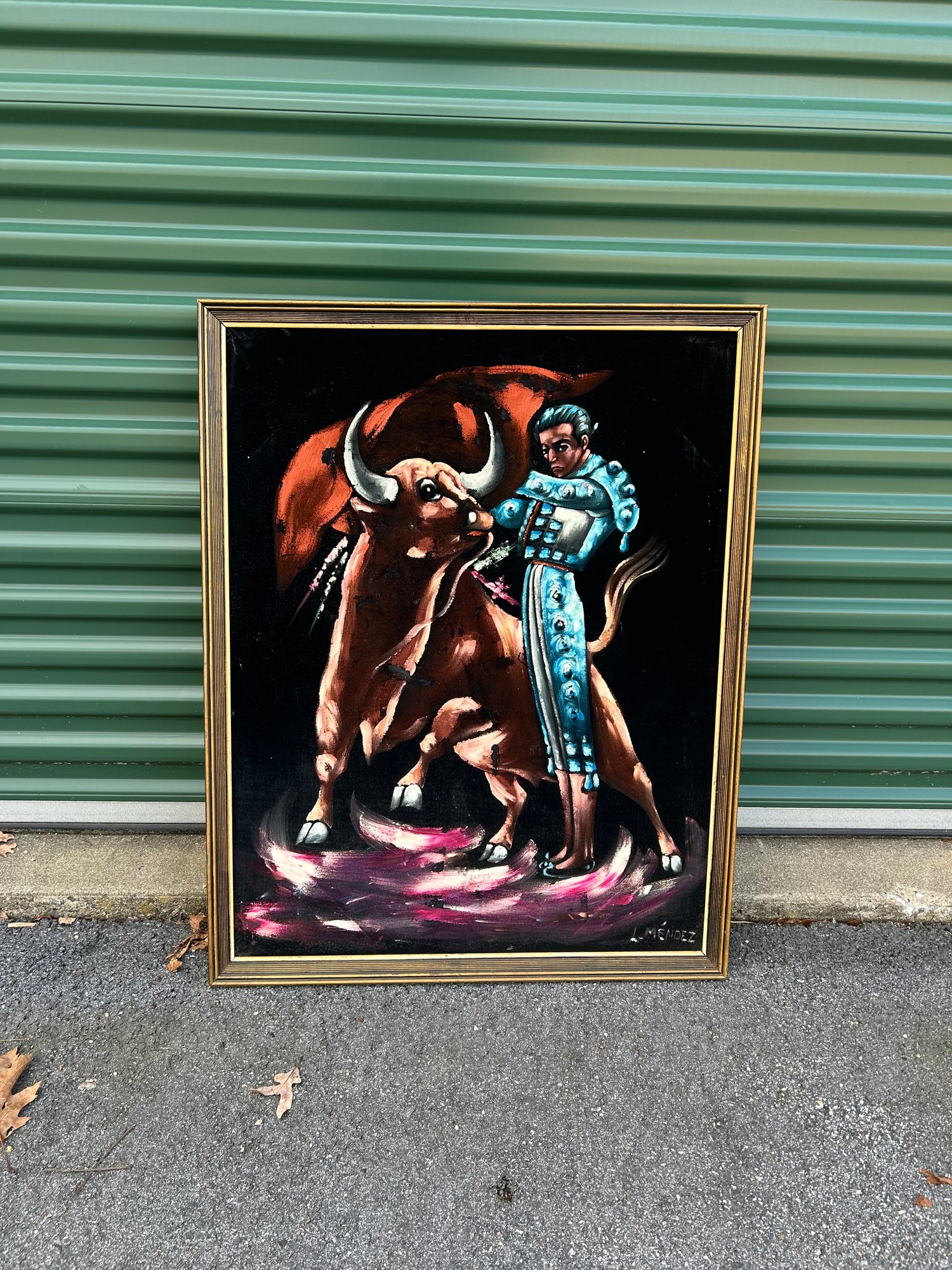 Approximately 29.5” by 37”. Signed L. Mendez. Has some wear and soiling but no major damage.