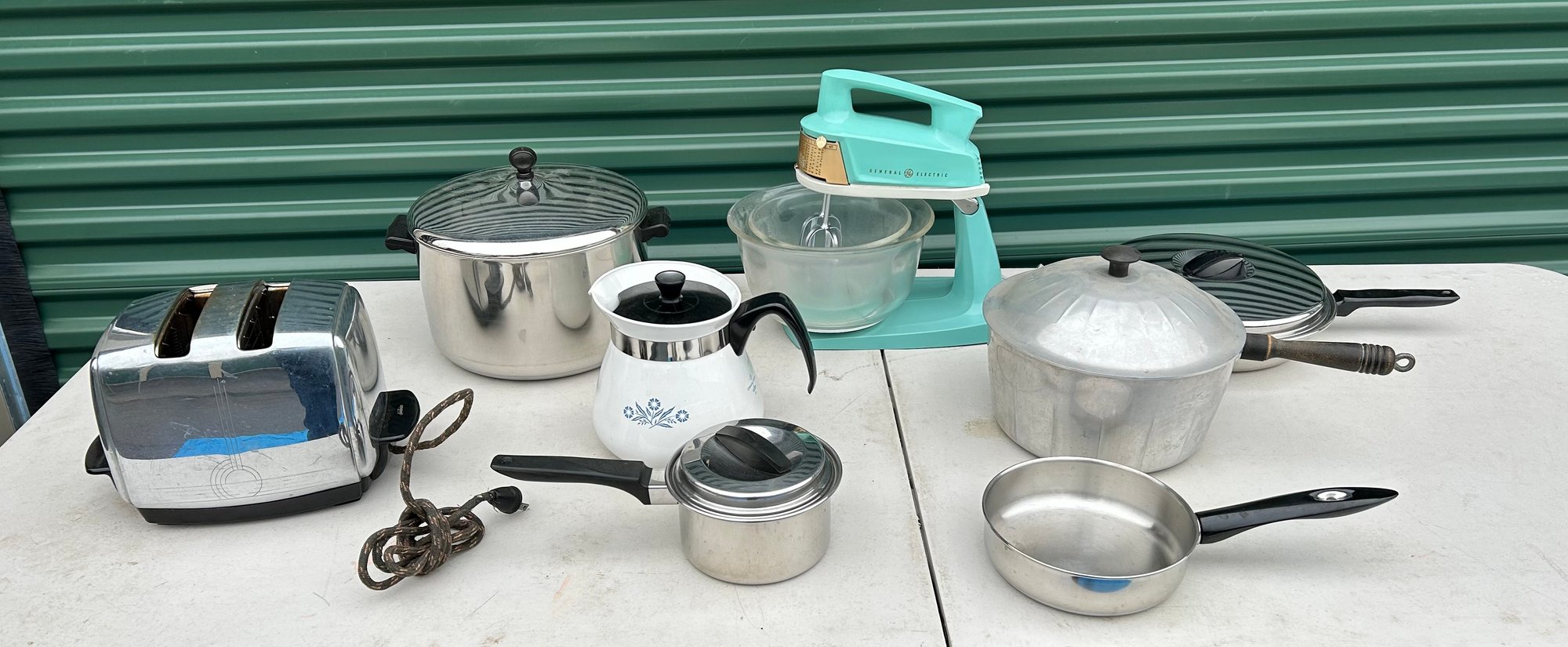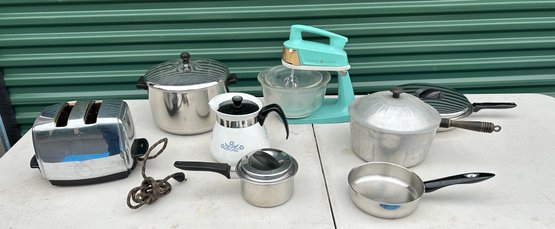 General Electric mixer with 2 bowls and embroidered cover, Sunbeam toaster, Corningware coffee pot and several pieces of cookware. Generally good condition.