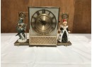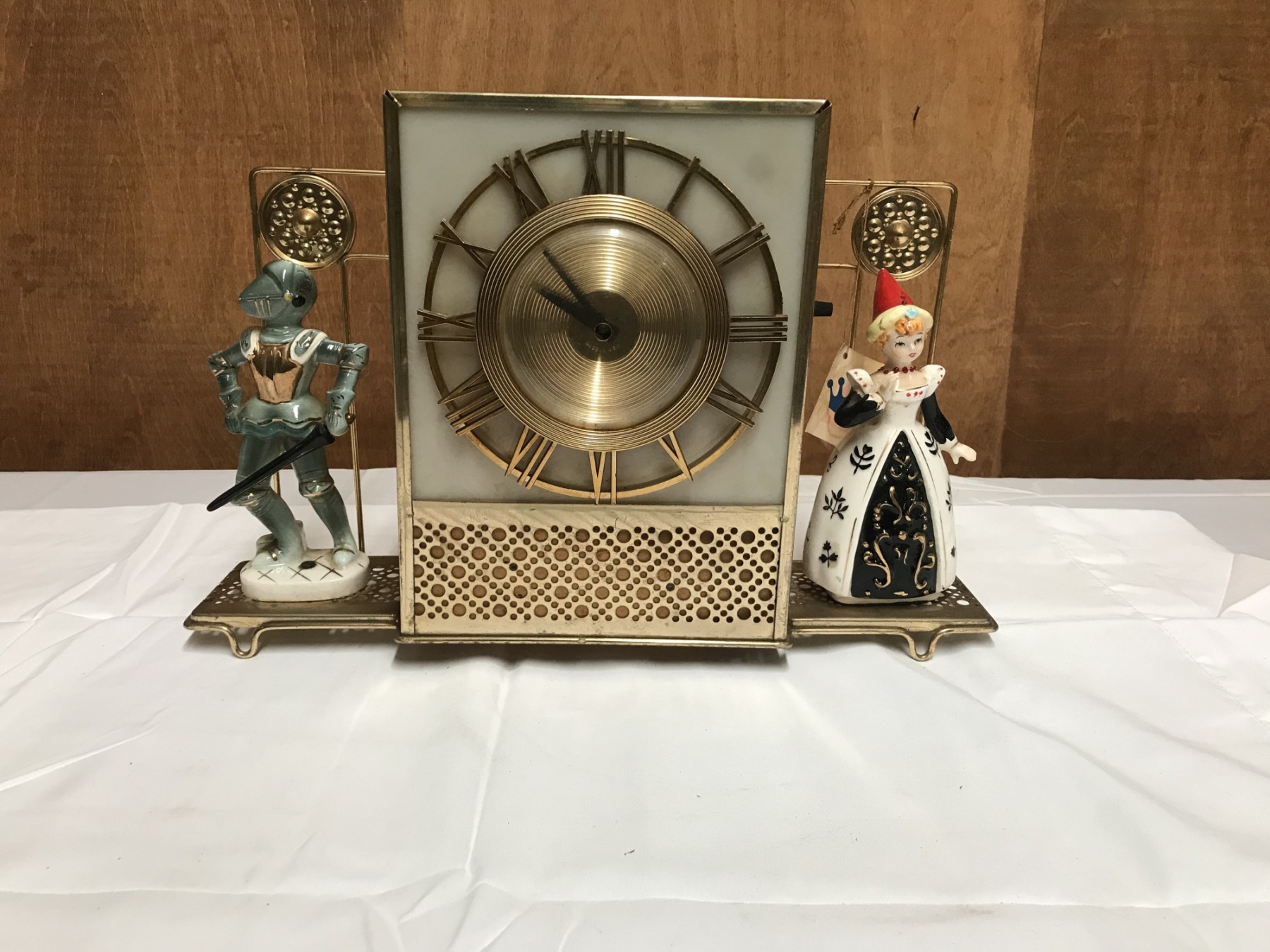A really cool MCM clock with knight and princess figures. Lights up and powers on but untested. 15.5” wide by 10” tall.