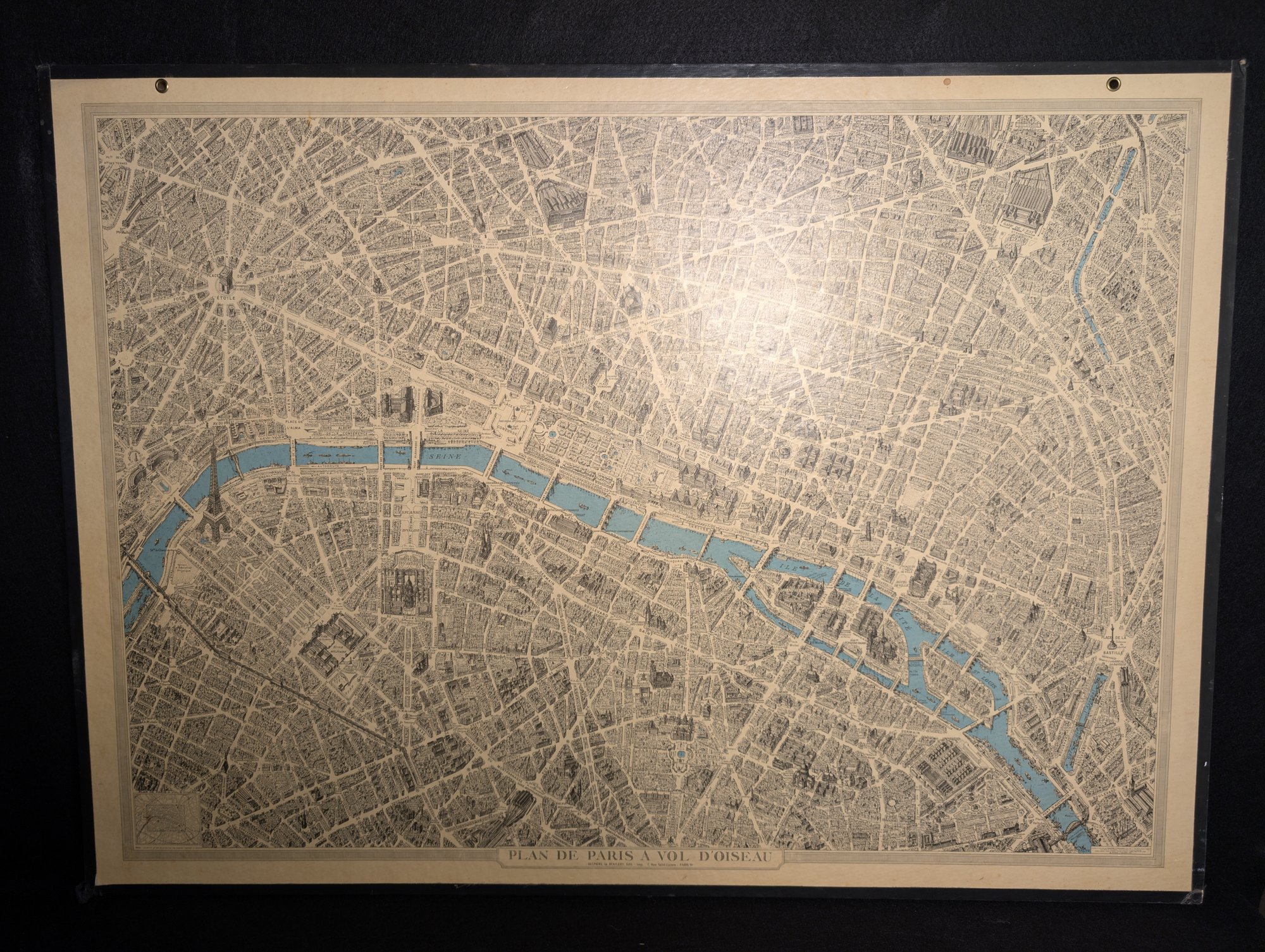 Mounted on half-inch thick poster board, with 2 holes for hanging.