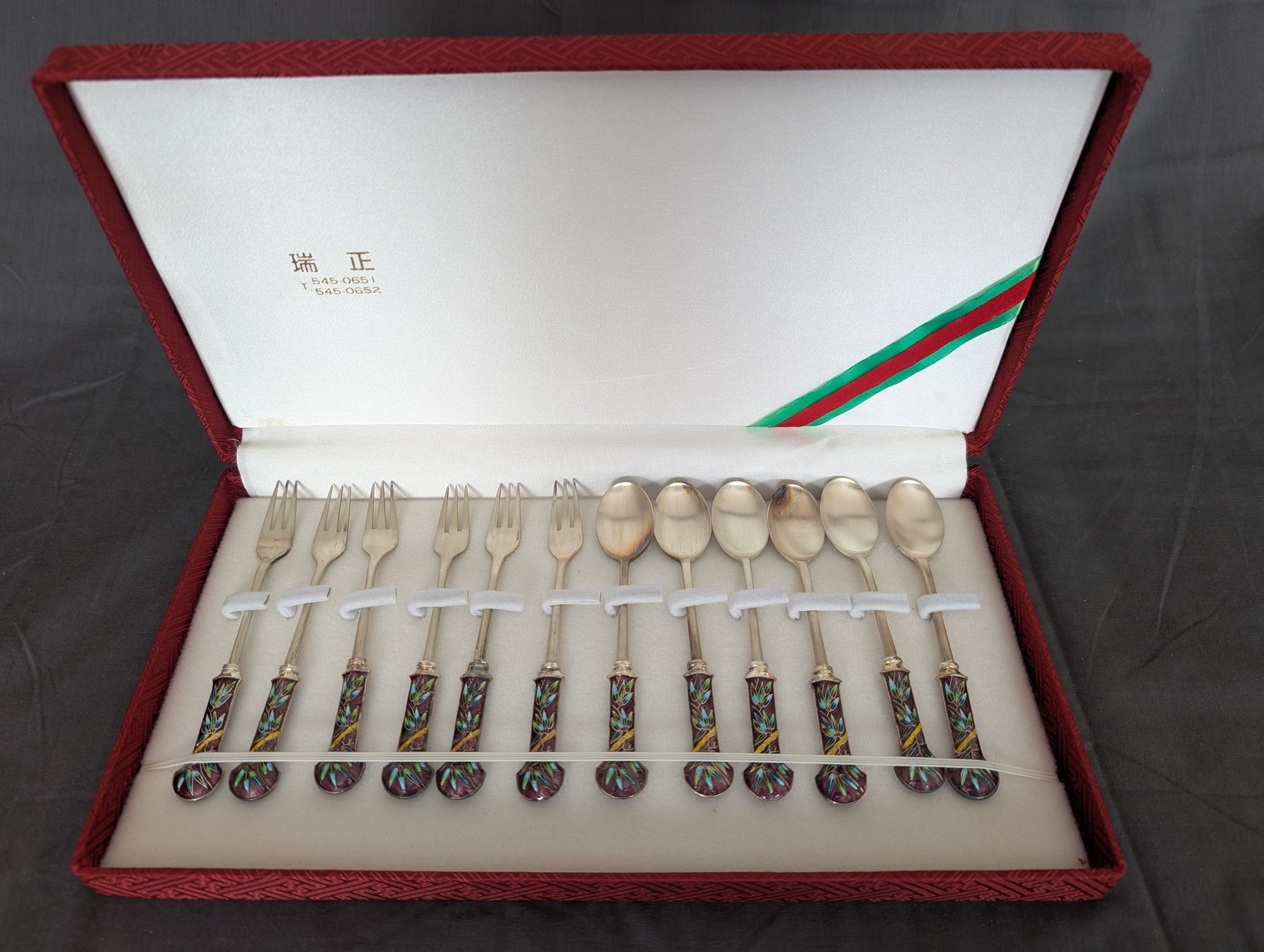 Beautifully designed enameled handles mounted on Asian silver forks and spoons; in original presentation box (silk lined)
