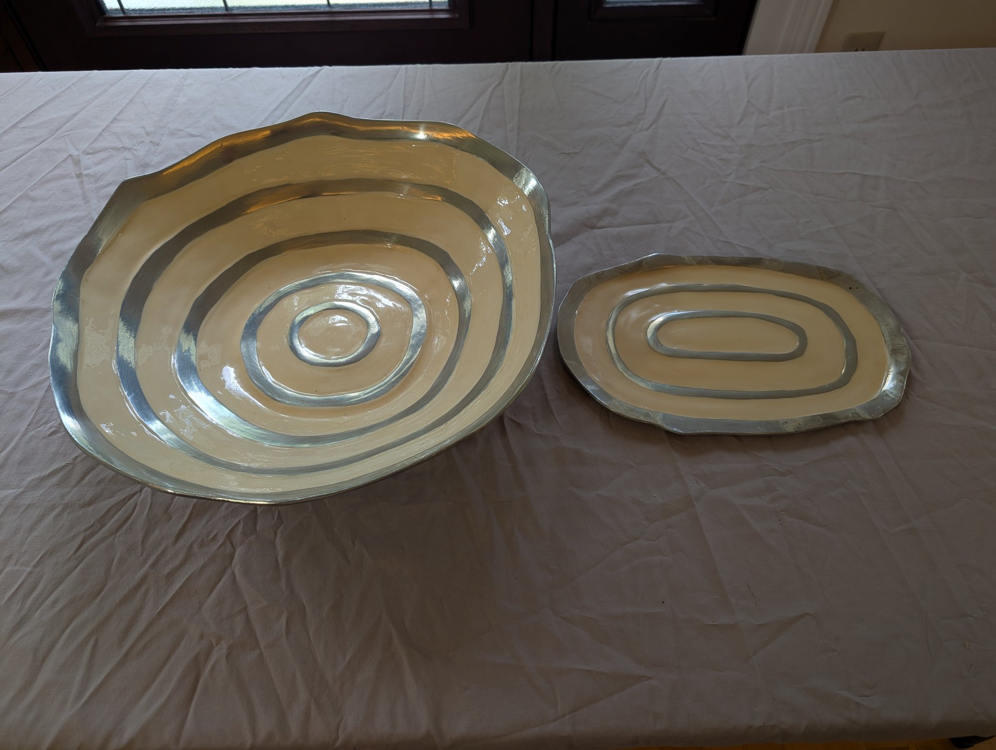 16" diameter bowl, 3 1/2" tall. Platter 8" wide,12" length