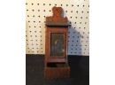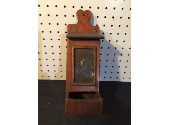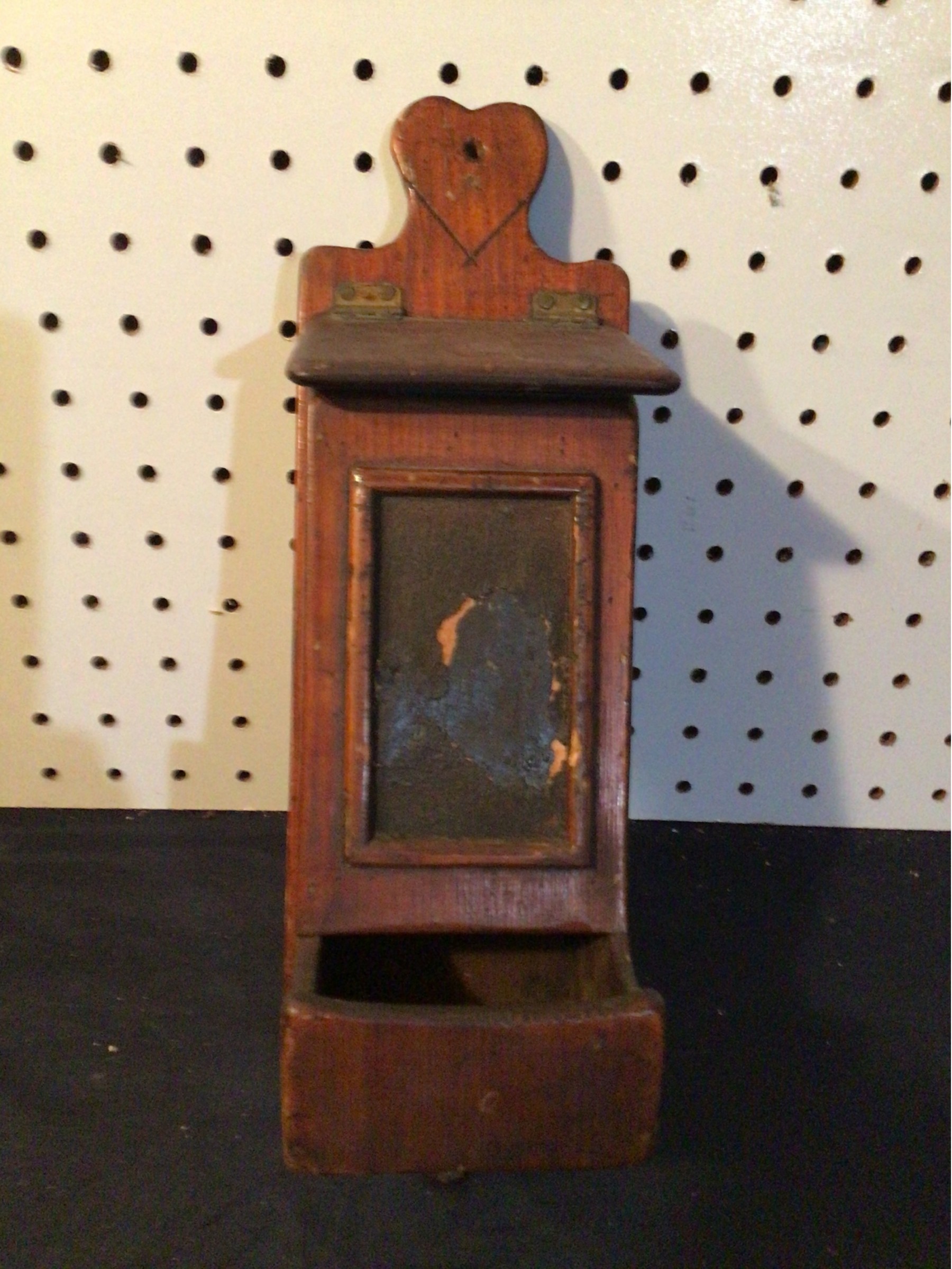Original pipe box with matchstrike surface area on front. 12” in height, heart shaped arT top, hinged lid. American primitive pine construction.