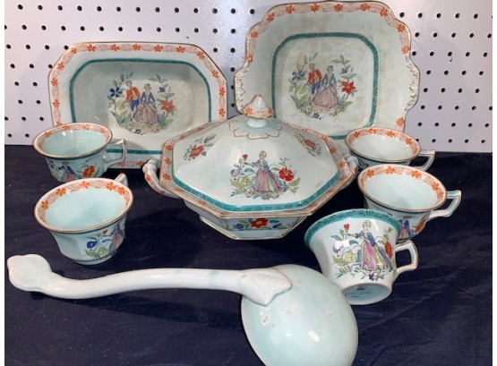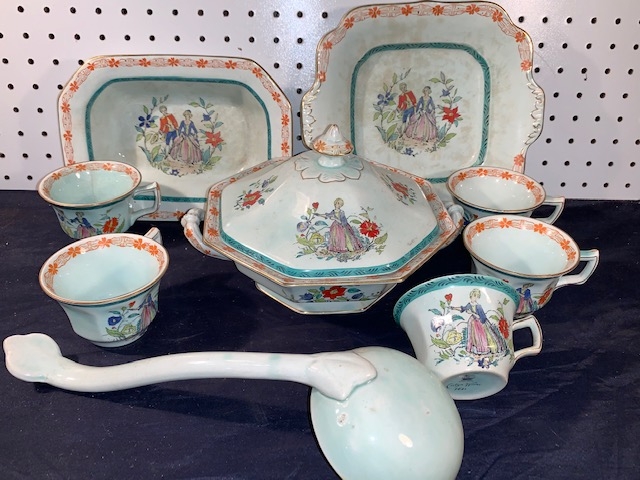 Antique Adams Calyx Ware as shown in the photos. Covered Serving Bowl, 2 Serving Pieces, 5 Teacups, and the Soup Ladle. All in nice condition, with the pattern as shown.