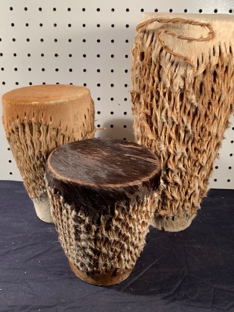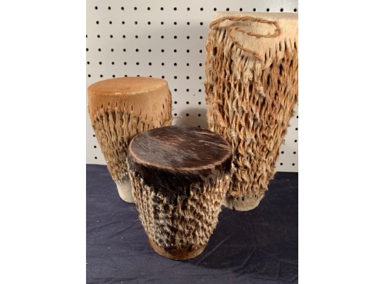 3 Hide Covered African Drums, from a local Museum's Collections, being deascessioned. Each in excellent condition. 6” to 12” in height: