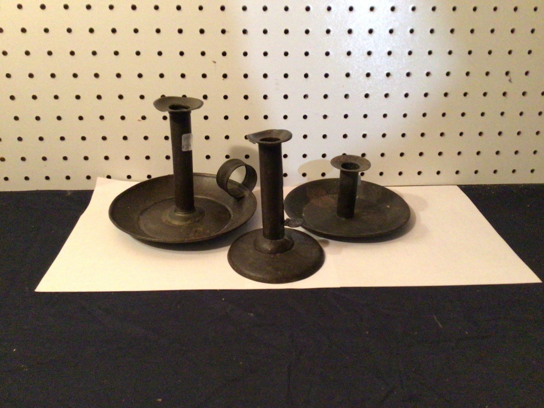 Three 18thC Early Tin Candlesticks - Americana, a good working Pushup, Handled Chamberstick, and 3rd stick. From a local Museum Collection being Deascessioned.