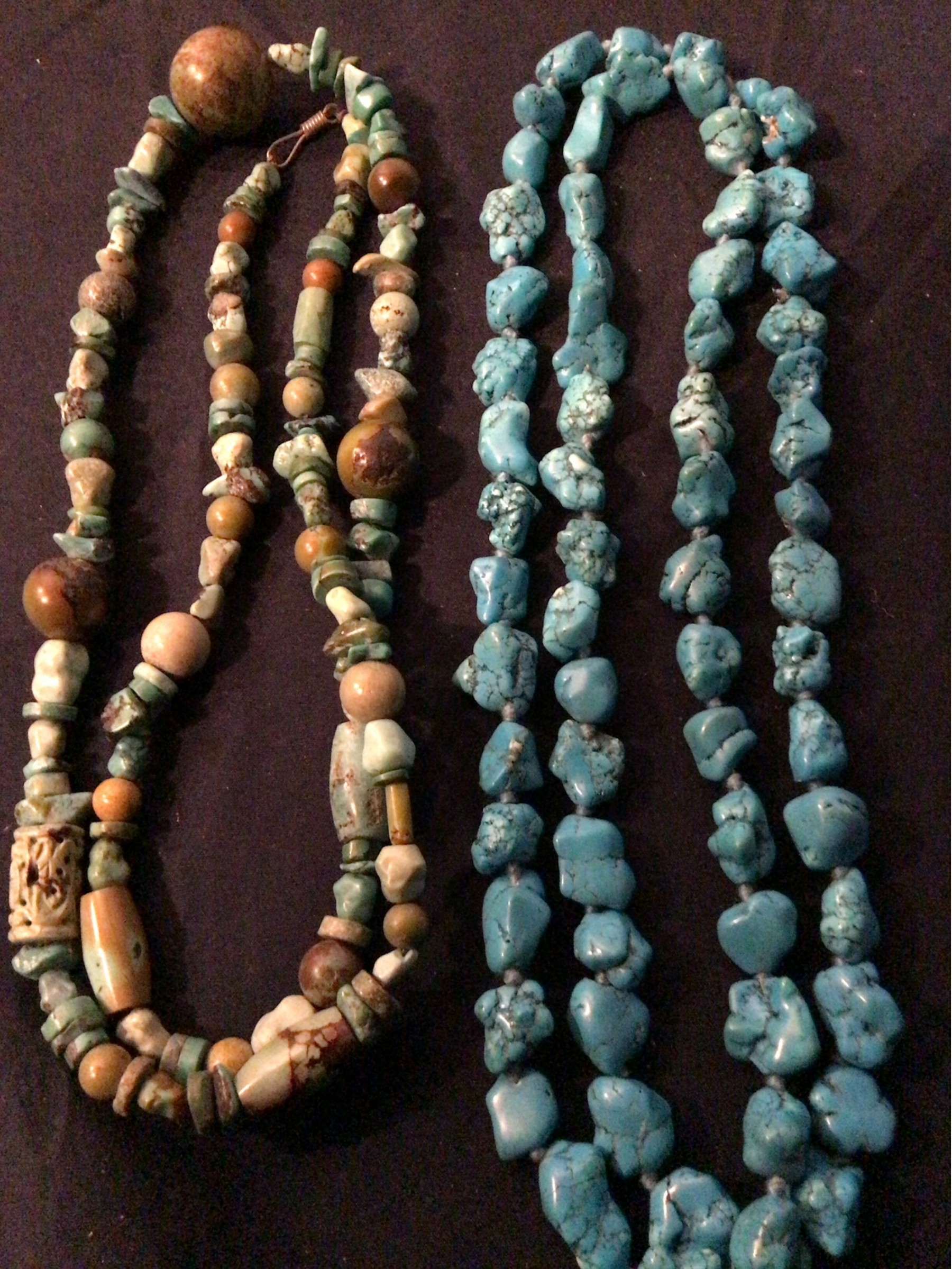 Two Turquoise necklaces; in excellent condition. Shown double loop in photos. Worn as a single strand would be 15” and 17” respectively. Can be worn single strand or as shown.