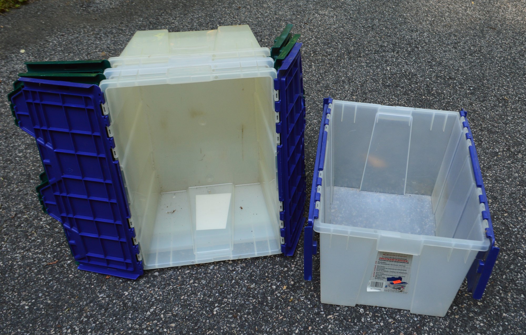 Four plastic fold up storage bins.
