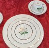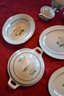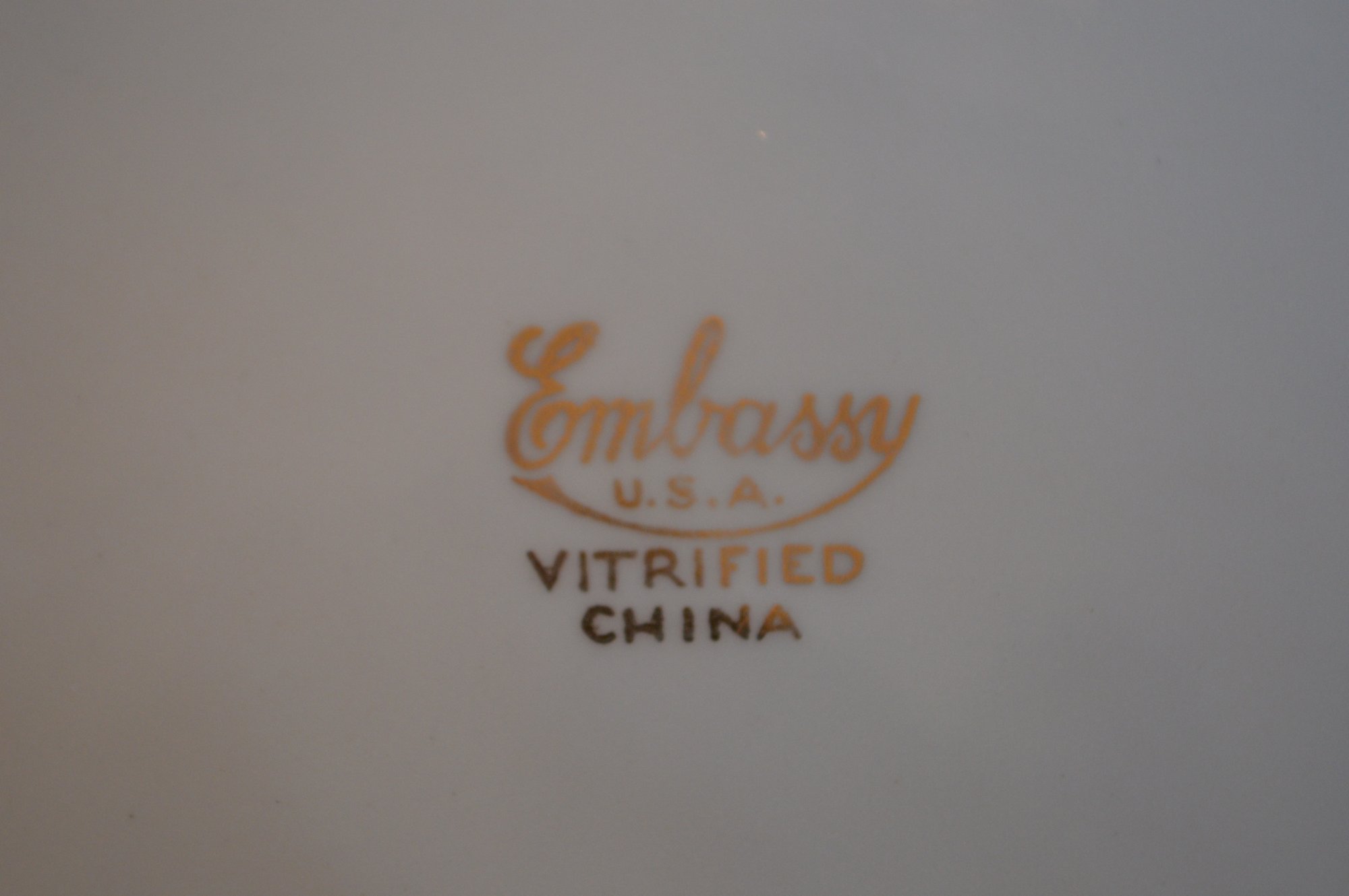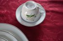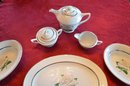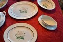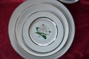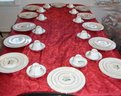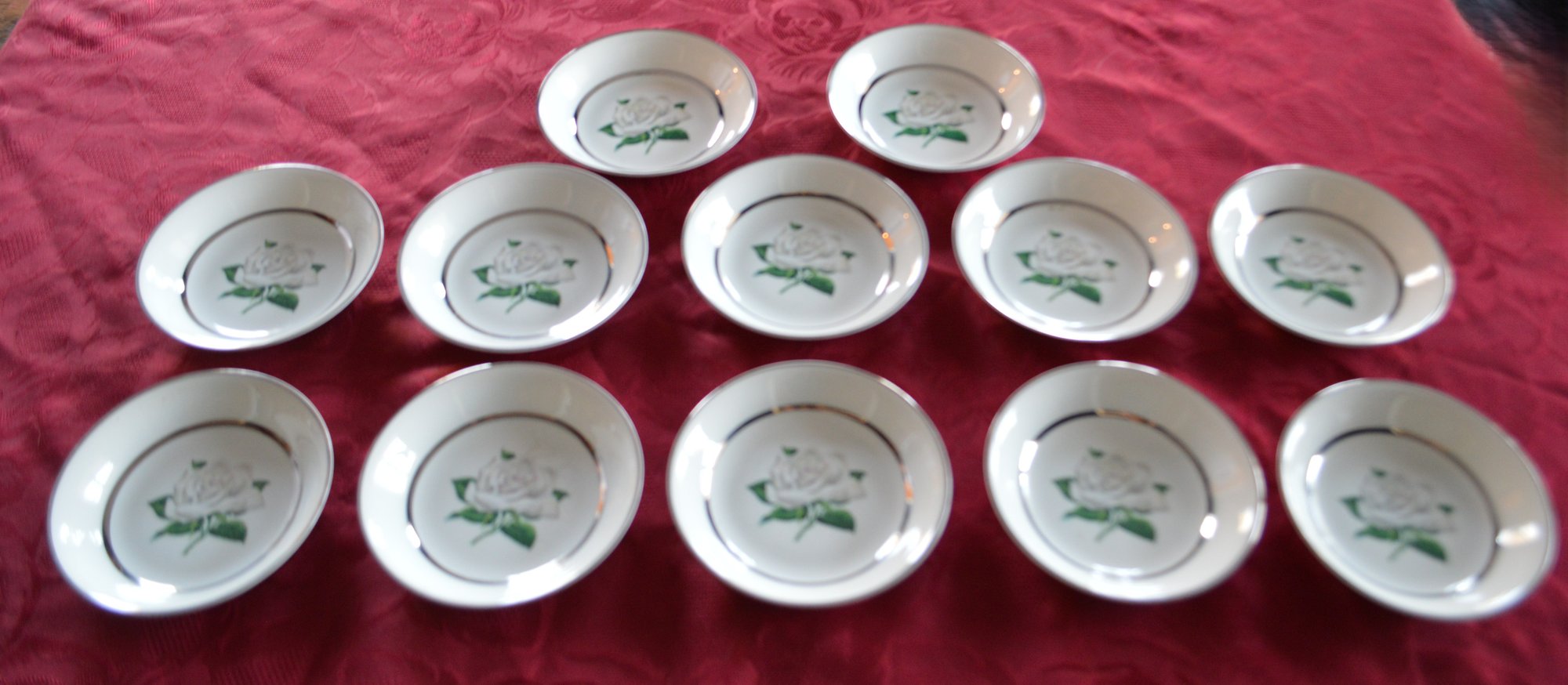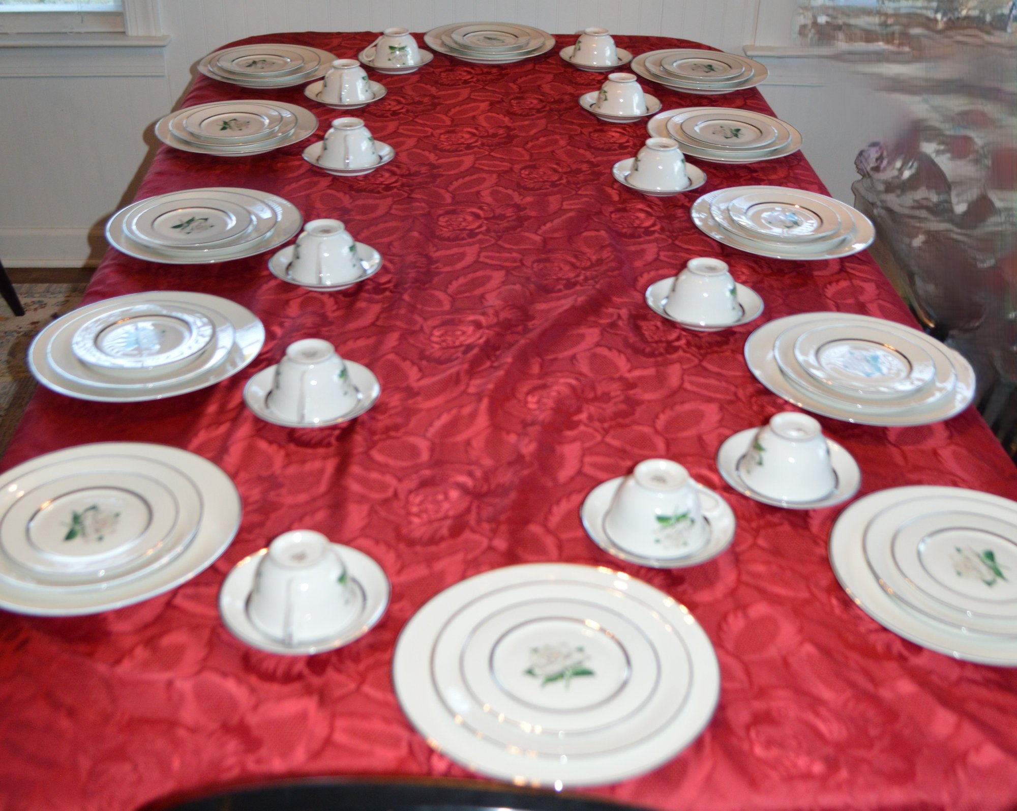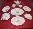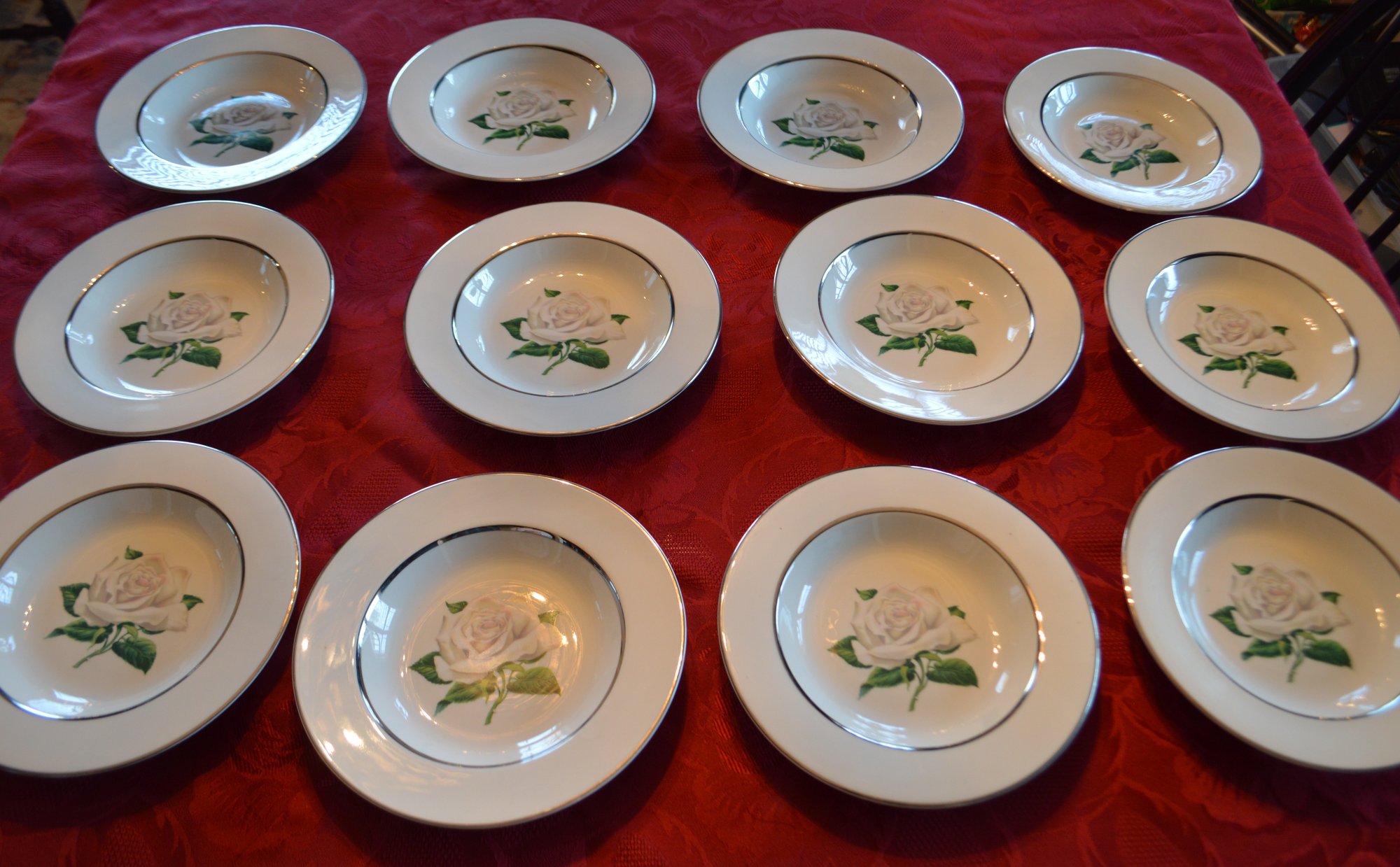 This full 12-piece set has 12 dinner, salad, and bread plates, 12 soup and fruit bowls, extra serving pieces, 12 coffee cups and saucers 9 include: Coffee pot, sugar and creamer, a large and medium platter, covered vegetable bowl, and gravy boat. The only piece to have a defect is one soup bowl has a chip on the lip edgei Otherwise the silver edges and lining rings are in great shape. Handwash only. Replacements.com does have this pattern and extra pieces currently in stock . This is a discontinued pattern. All pieces have been foam and bubble wrapped, and are ready for pick up. The box is quite heavy due to the vast amount of place settings. Shipping would be available but may be costly due to weight .