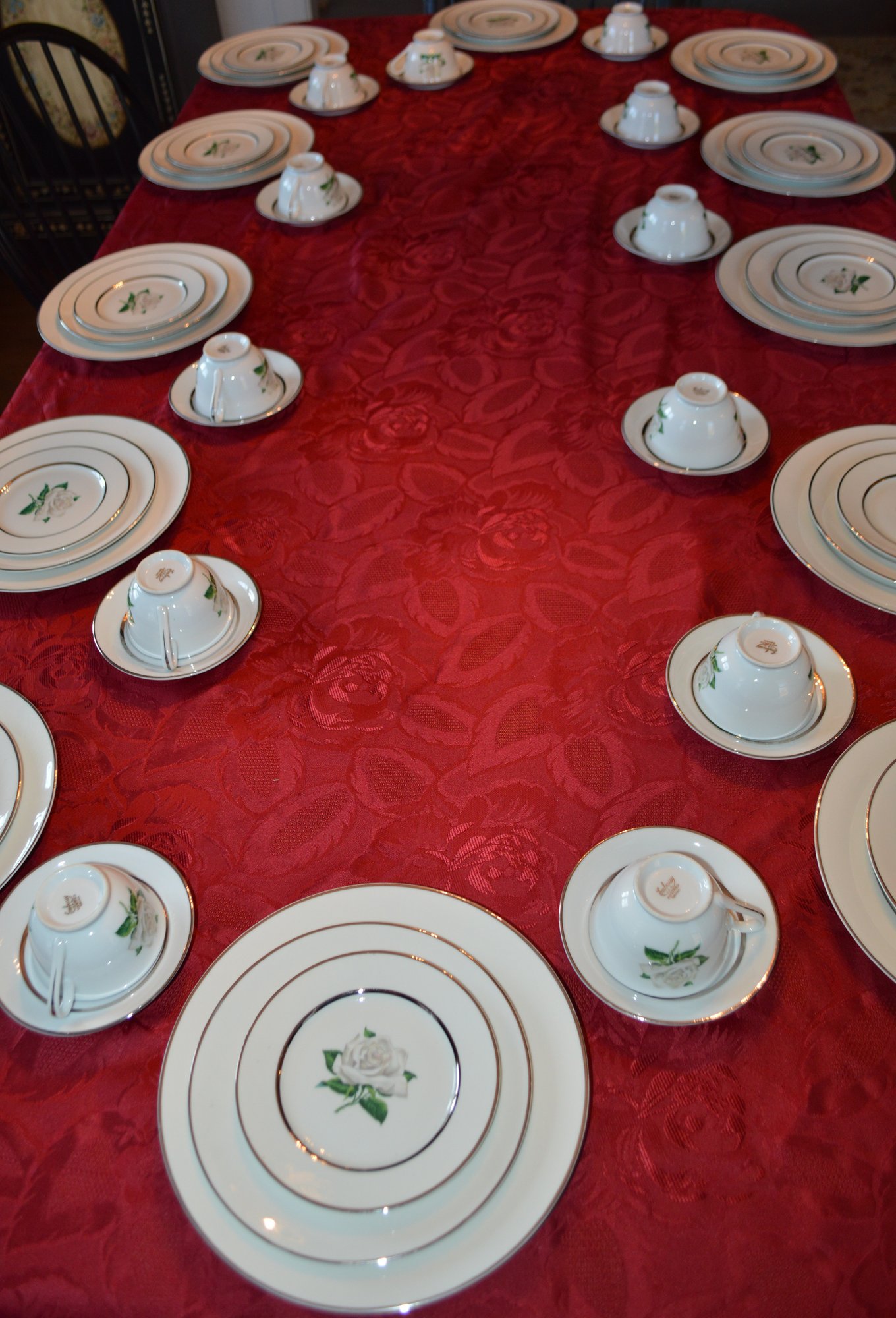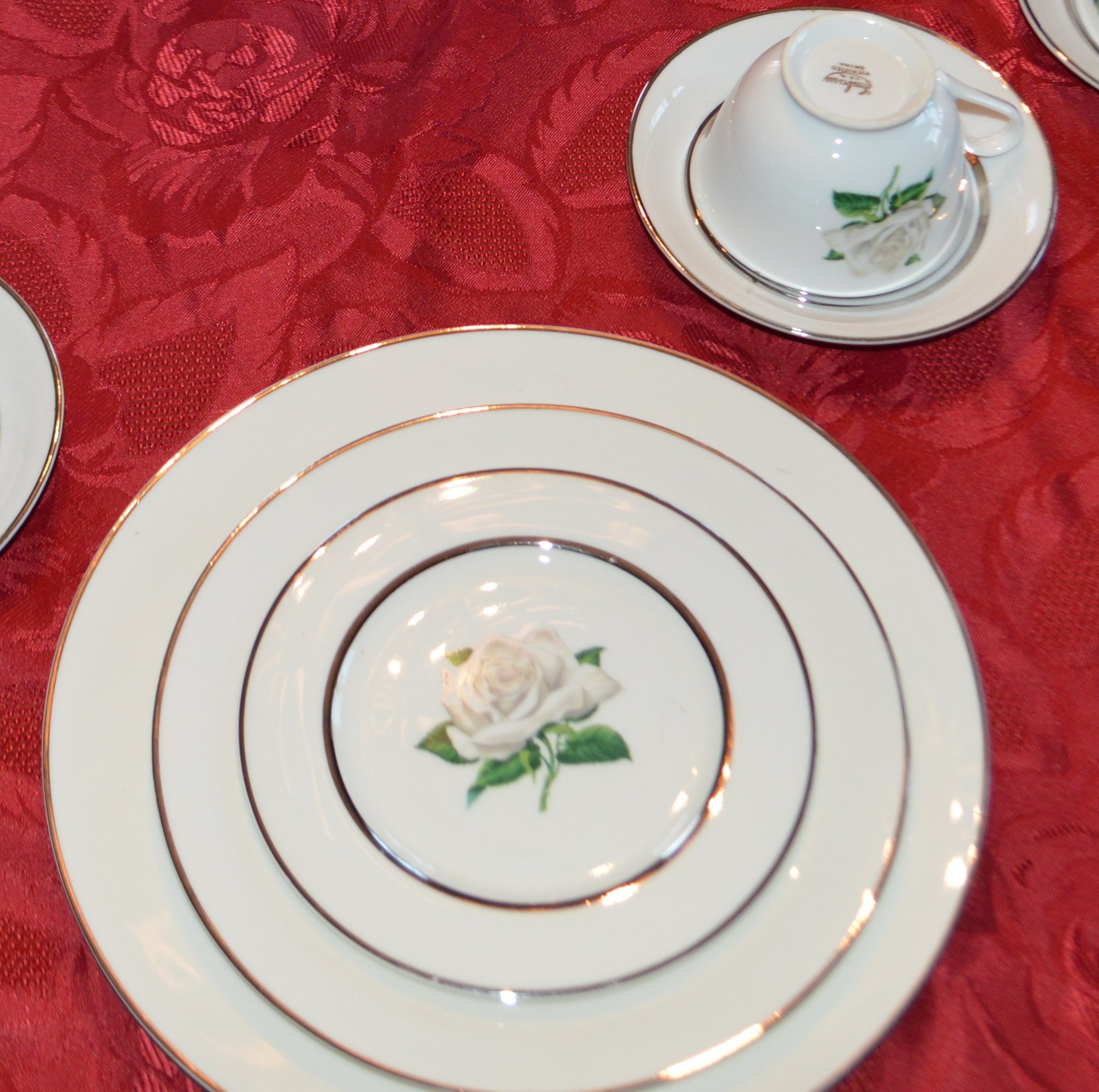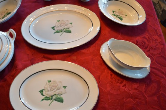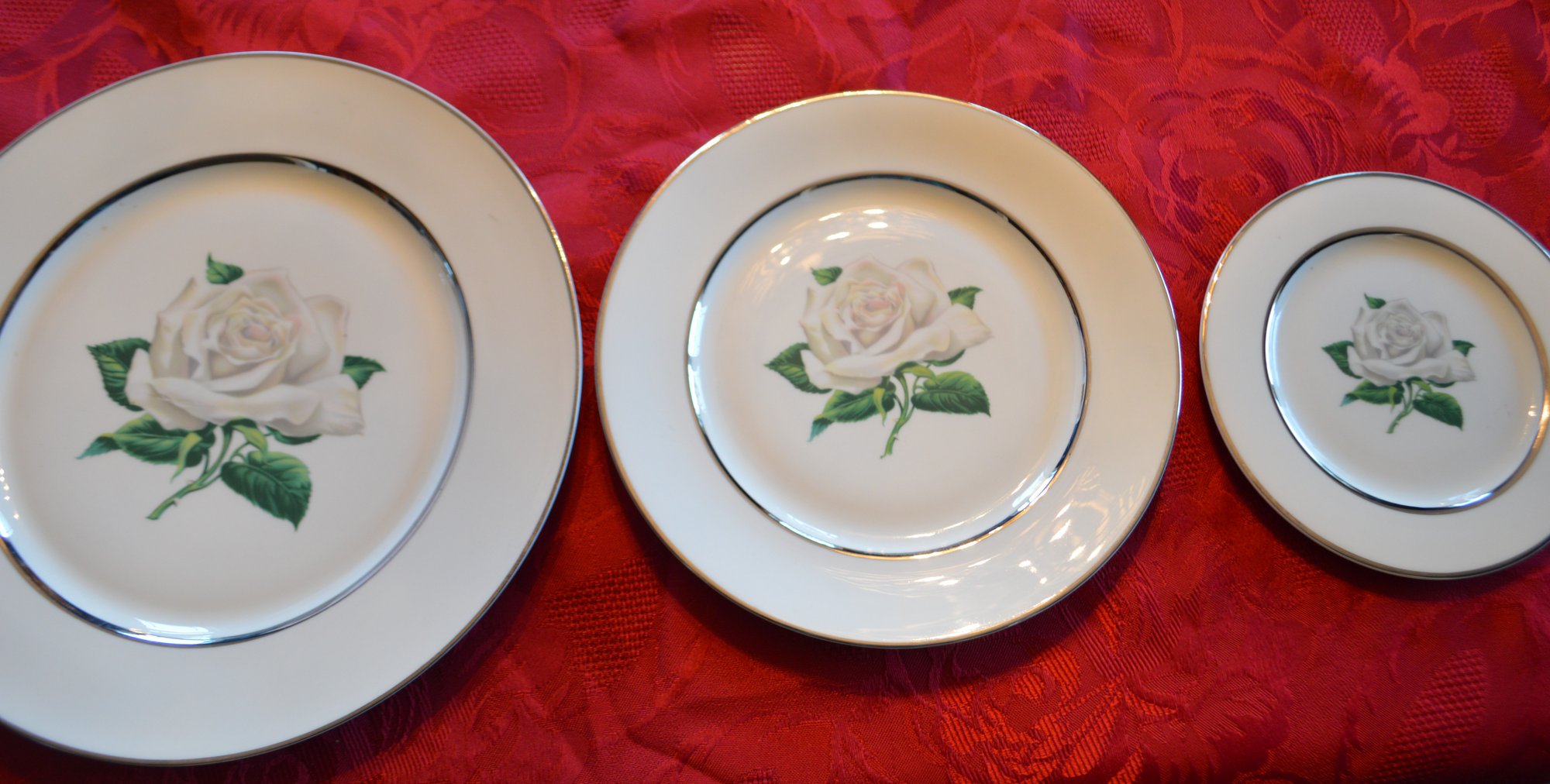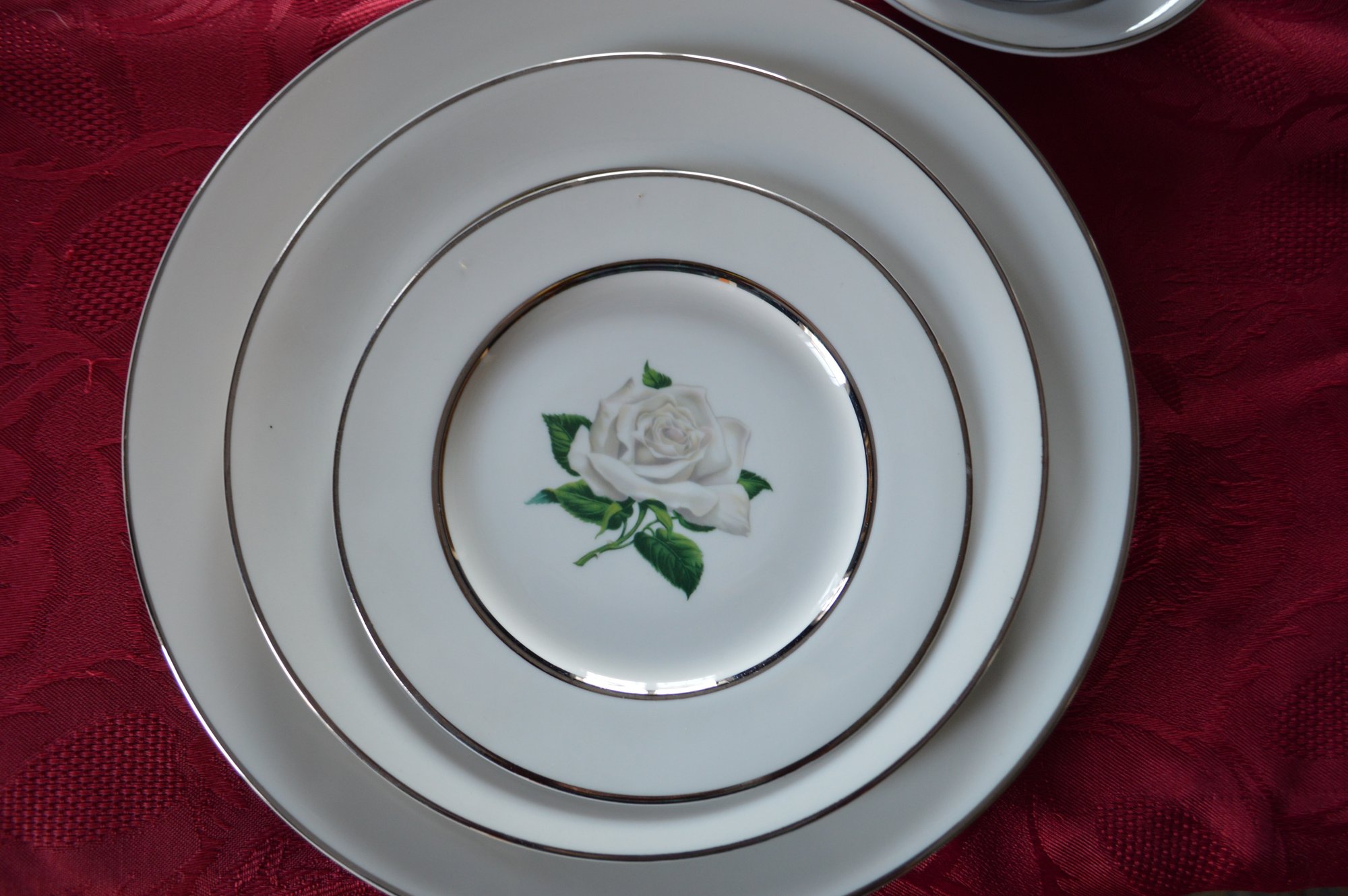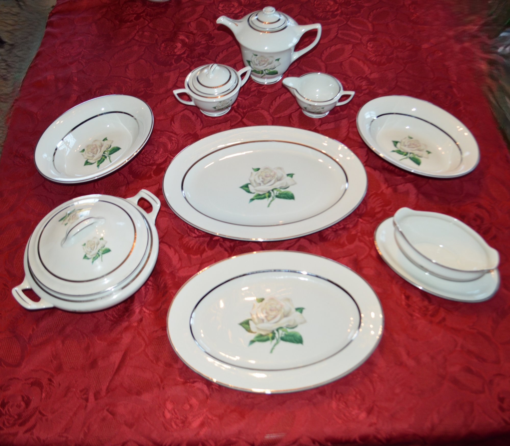 Grey Rose Made in USA vitrified China. This beautiful set is perfect for a wedding present for a happy couple. The white rose also stands for Eternal Love and New Beginnings.