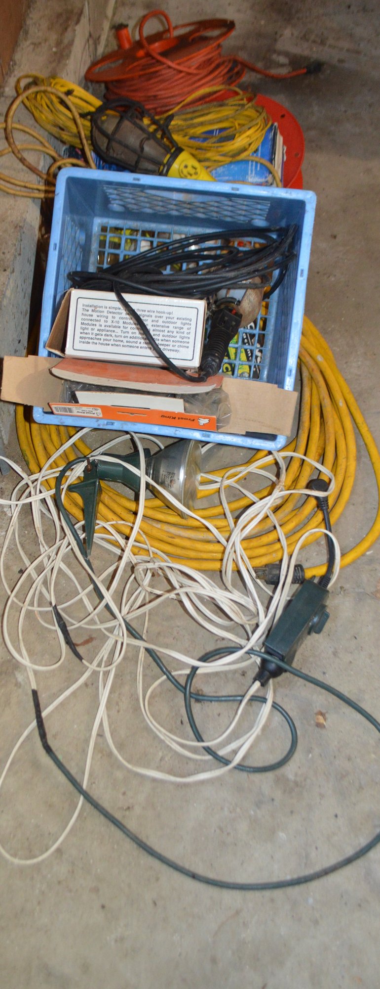 Many different sizes of extension cords, a work light, some roof heat tape and a motion decector