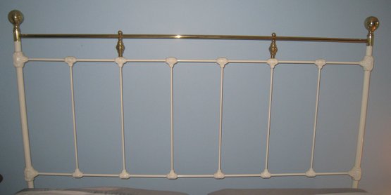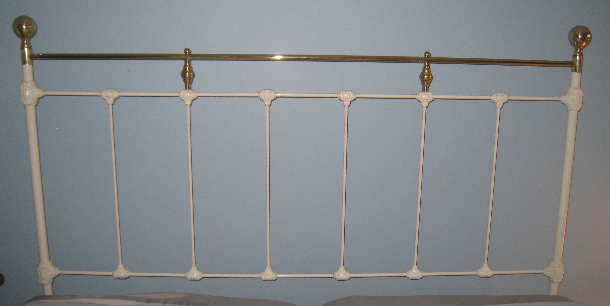 Antique white metal w. brass ball finial poster tops. Comes with frame but not mattress. 76.5x61