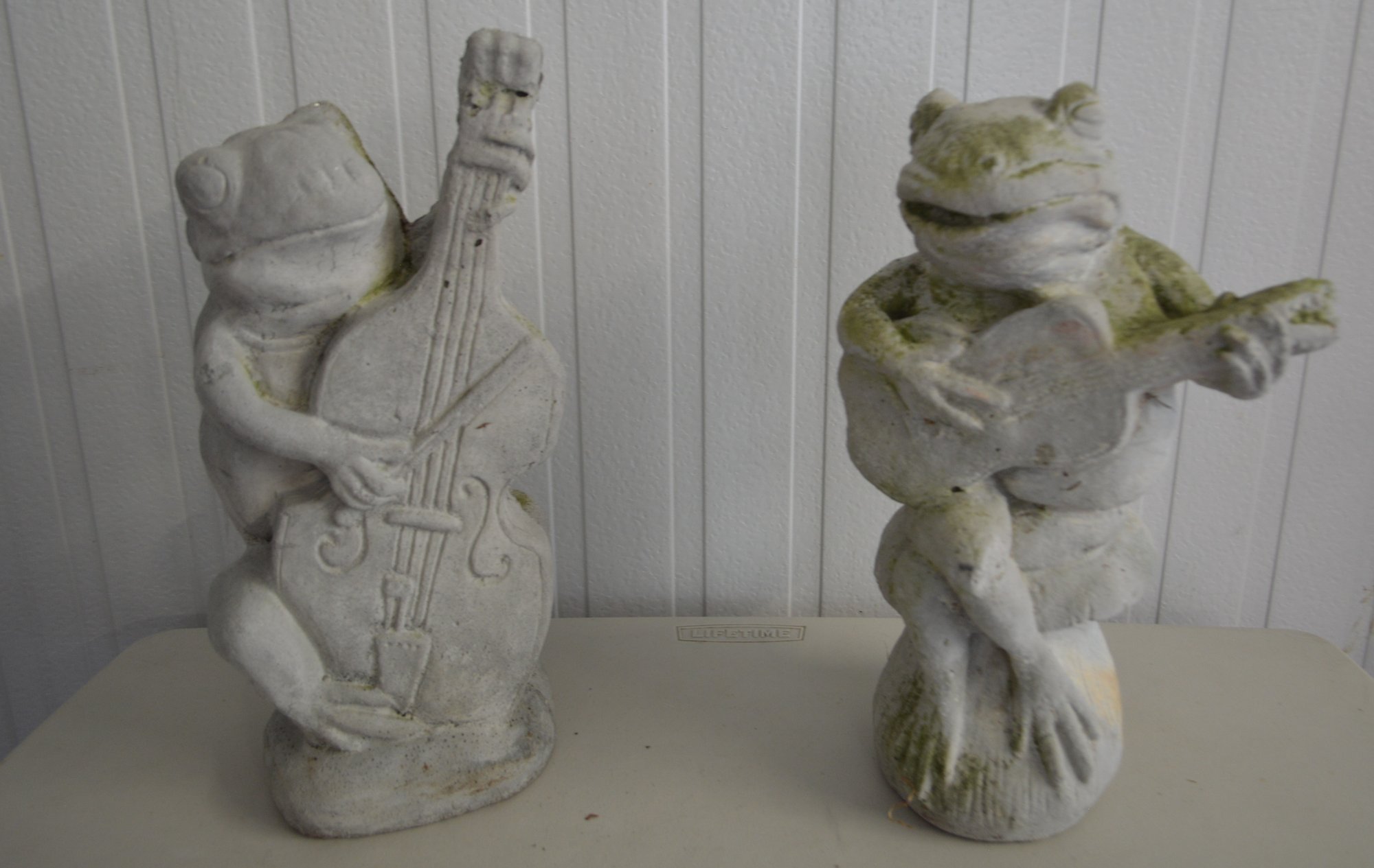 Two cement frogs, lightly power washed to show better detail