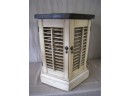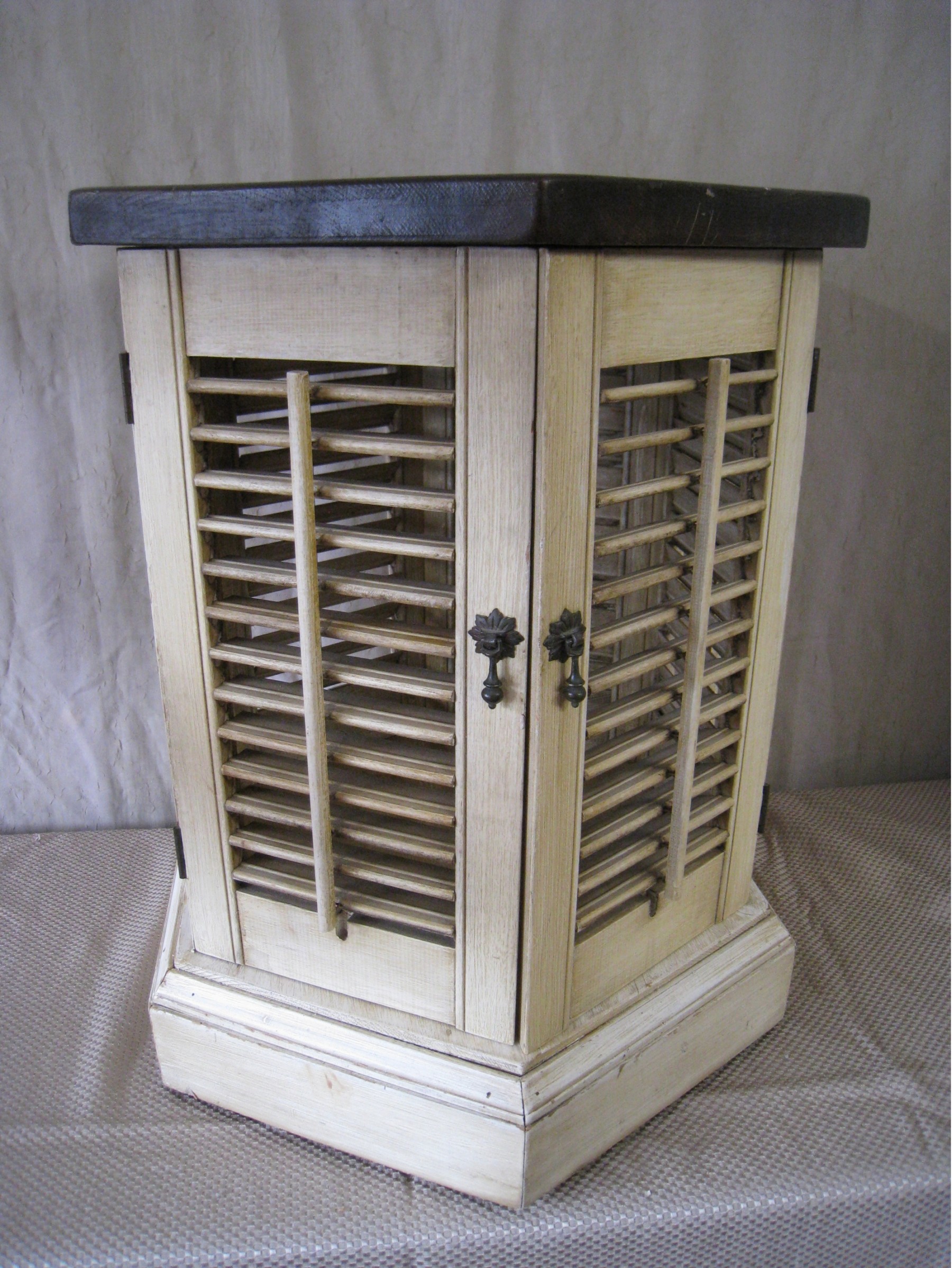 Shutters open and close. Front doors open for hidden storage. Features a hexagon top
