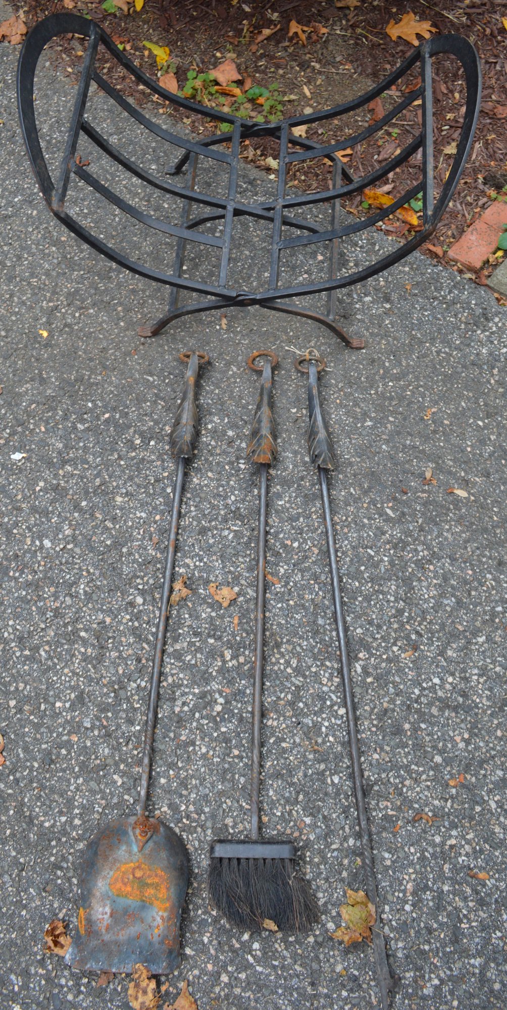 Tool set has decorative oak leaf pattern and o rings to hang the tools on your hearth. Will clean up with a little stainless-steel pad to remove surface rust on shovel.
