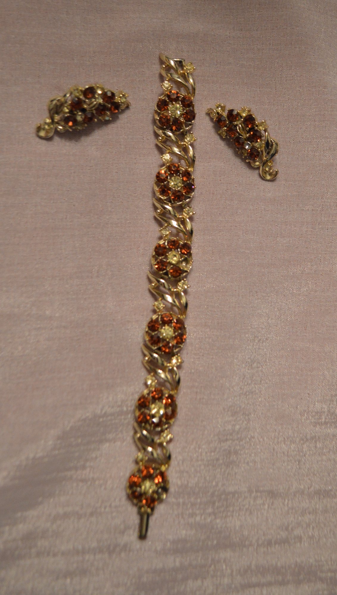 Ring, bracelet and earrings for pierced ears. Please not one of the flower cluster gemstones on the bracelet is missing one stone , has matching ring not shown in picture,