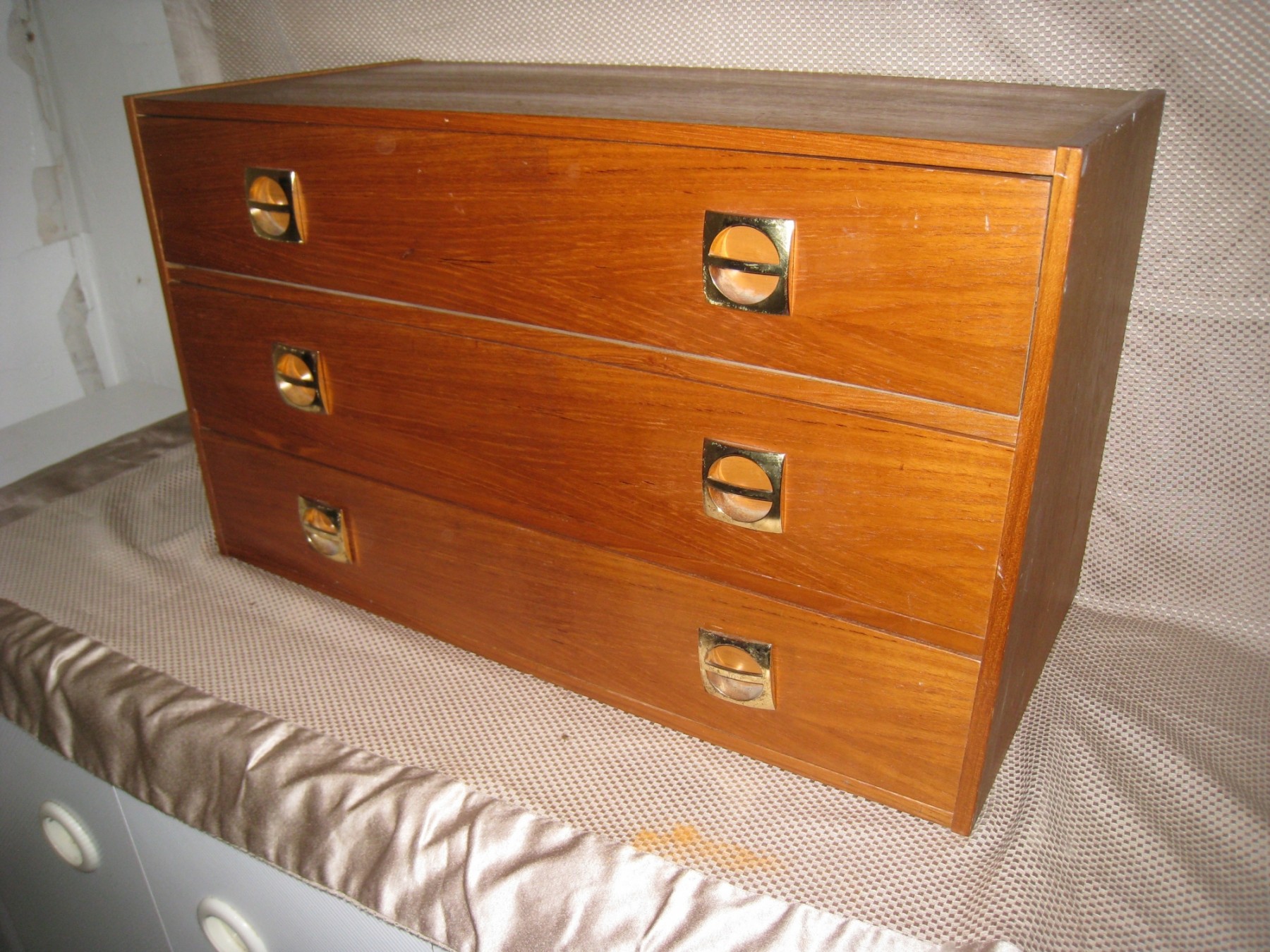 3 drawers to store......what have you? Lovely wooden case with brass colored hardware. Would easily fit in a closet or on top of another dresser or table. 30" x 14.5" x 17.5"