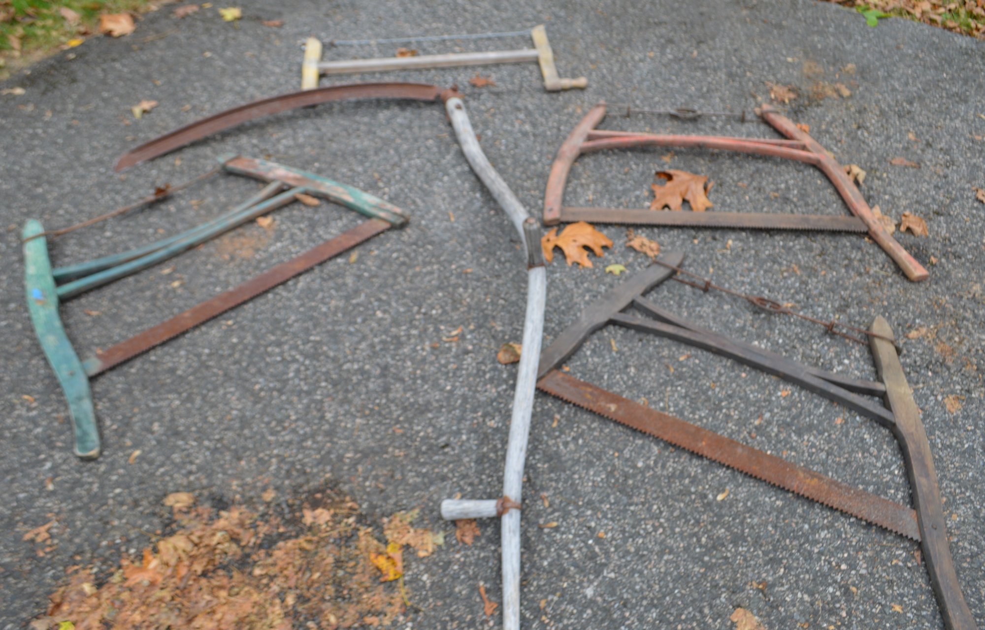Antique Large blade Scythe and three Cross Buck saws and extra wood cutting saw.