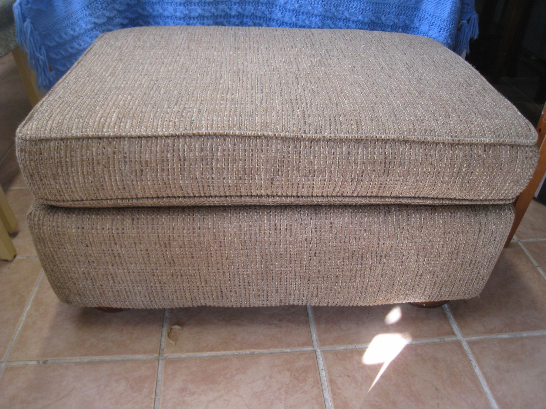 Taupe ottoman, has woven weave fabric to withstand foot or seat traffic