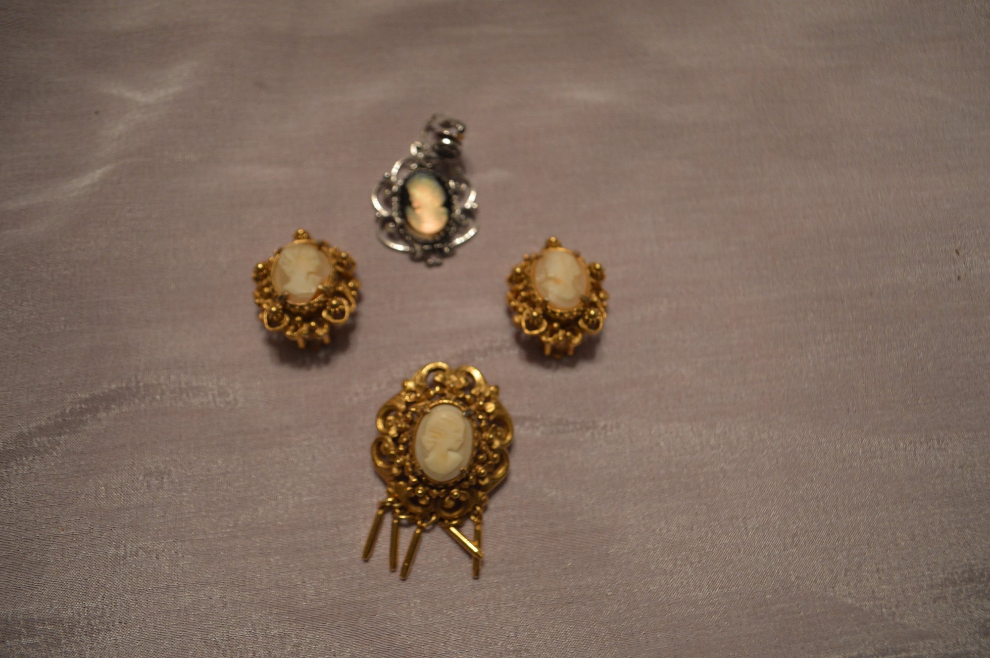 matched set of clip on with a brooch/pendant combo and one clip on that can be converted to a pendant