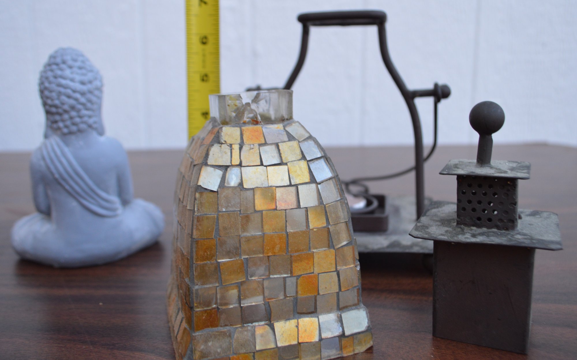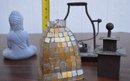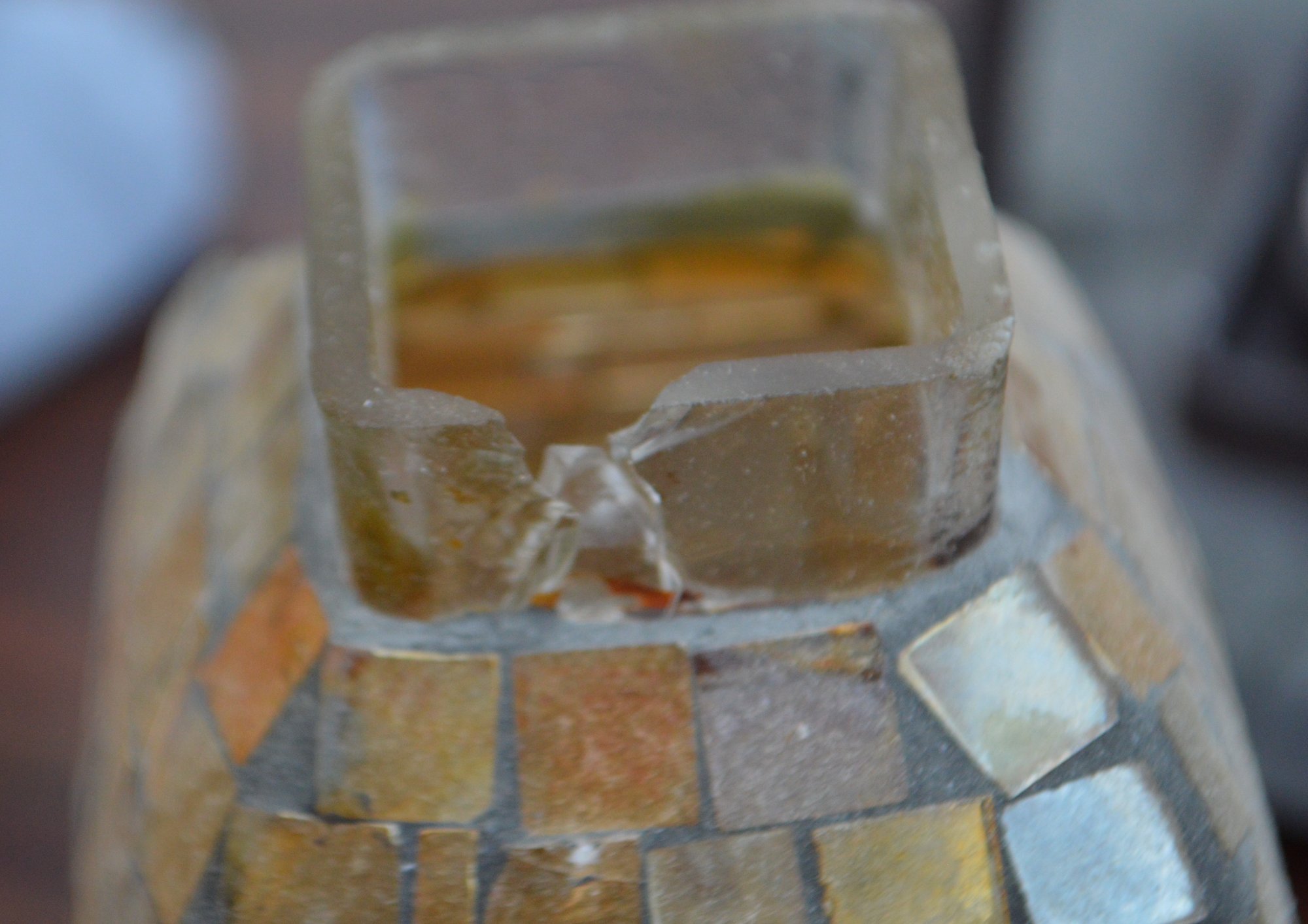 Tea light lantern has small chip in the lip where the metal cap fits over the glass shade otherwise both pieces are intact