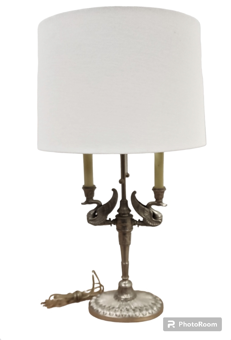 New, never used silver gilt neoclassical swan motif table lamps. 1 of 2