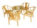 This sturdy table and Ming horseshoe style chairs is modern and stylish. The armchairs feature chinoiserie styled bamboo frames with rattan seats. Comfortable proportions and unique design make these perfect for everyday use in a dining room, kitchen or for secondary seating in a sunroom or game room. Chairs come with foam cushions that are easy to recover. The glass is 36" round.