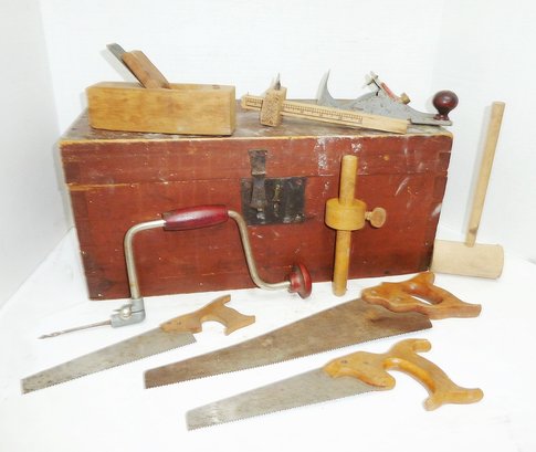 SHIP OR PICKUP ~ Wonderful antique dovetail construction wooden box with original red color, nice original lock in place, used over the years as a child's tool box. Some smaller scale tools included as shown. Nice primitive box with clean interior. Nice early ole timer that originally had an iron pull handle on each short side now missing. $3. BOX FEE APPLIES if you are shipping this item.