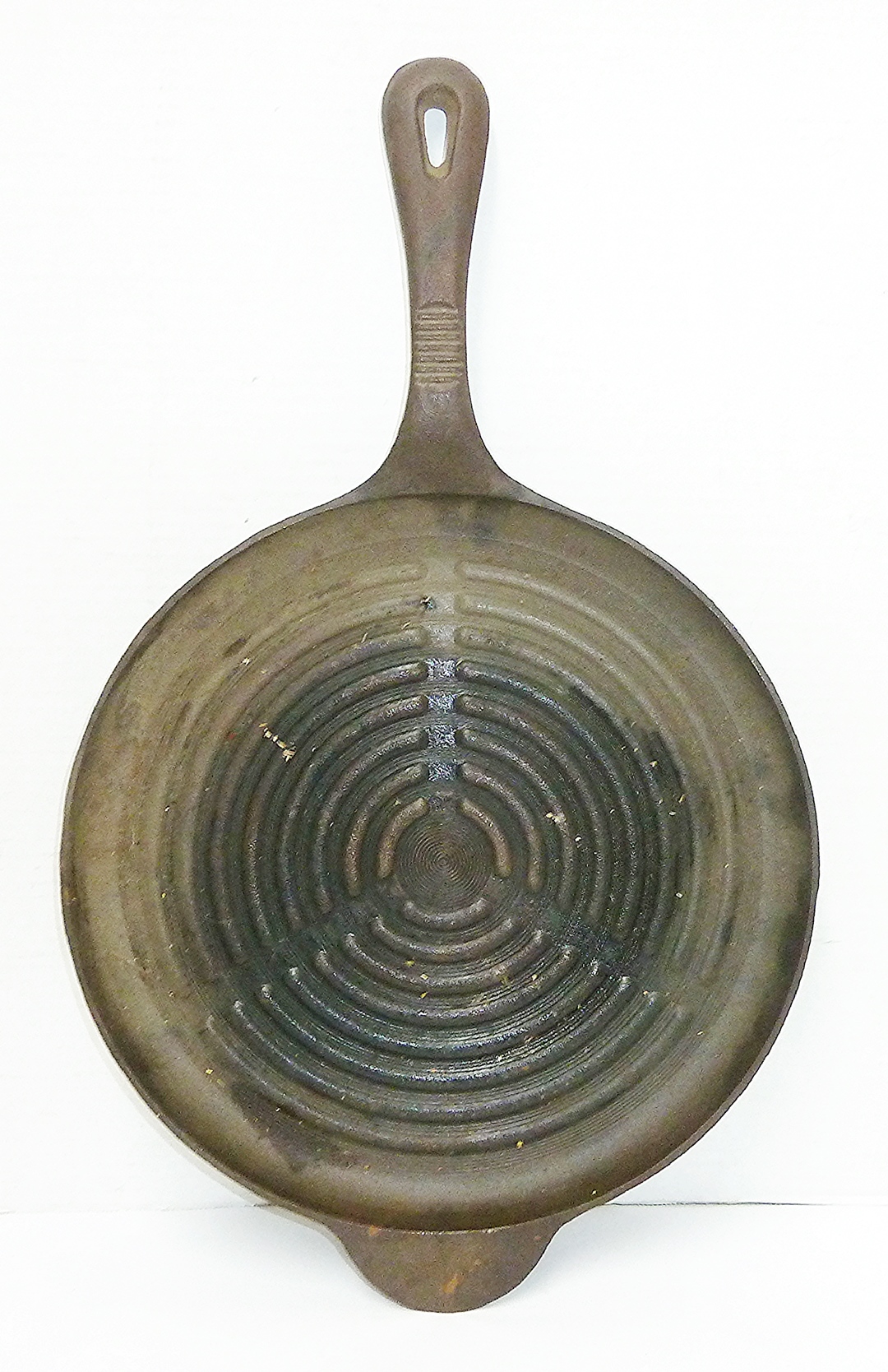 IN-HOUSE SHIPPING OR PICKUP AVAILABLE ~ Neat piece when you want to grill meats etc, this vintage cast iron griddle pan has ridged rings to put a sizzle on your foods! Marked with the name Benjamin & Medwin 12" size on the underside. Needs a quick cleaning it has been in storage for years. Add this to your kitchen cookware! $4. BOX FEE APPLIES if you are shipping this item.