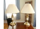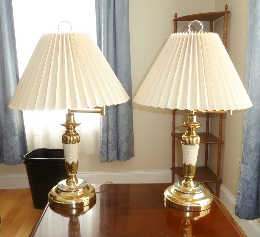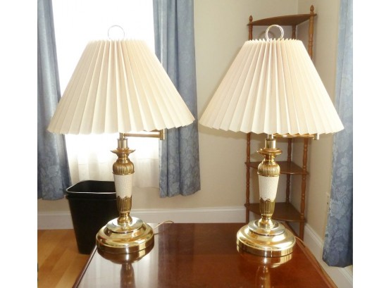 Nice looking PAIR of matched table lamps for your living room or bedroom, complete with original pleated shades. These are swing arm lamps so you can direct the light where it's needed most by moving the swing arm. Ready to use clean good looking condition