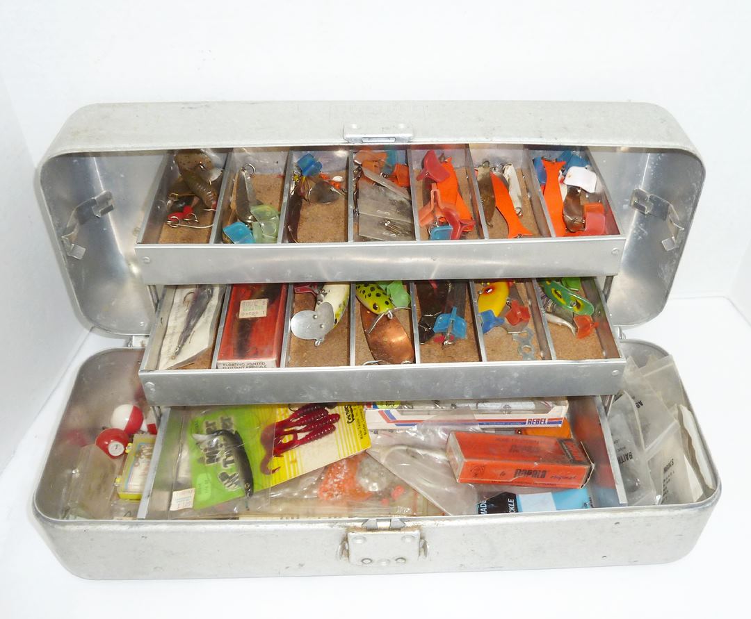 YES in house shipping available. Get ready to take this nice vintage metal tackle box along with you on the next fishing trip. Marked with the name "FOLD A TRAY" on the top, good working clasp. Full of fishing items, lures, bobs etc. take a look at the close up pic to get a peek inside.
