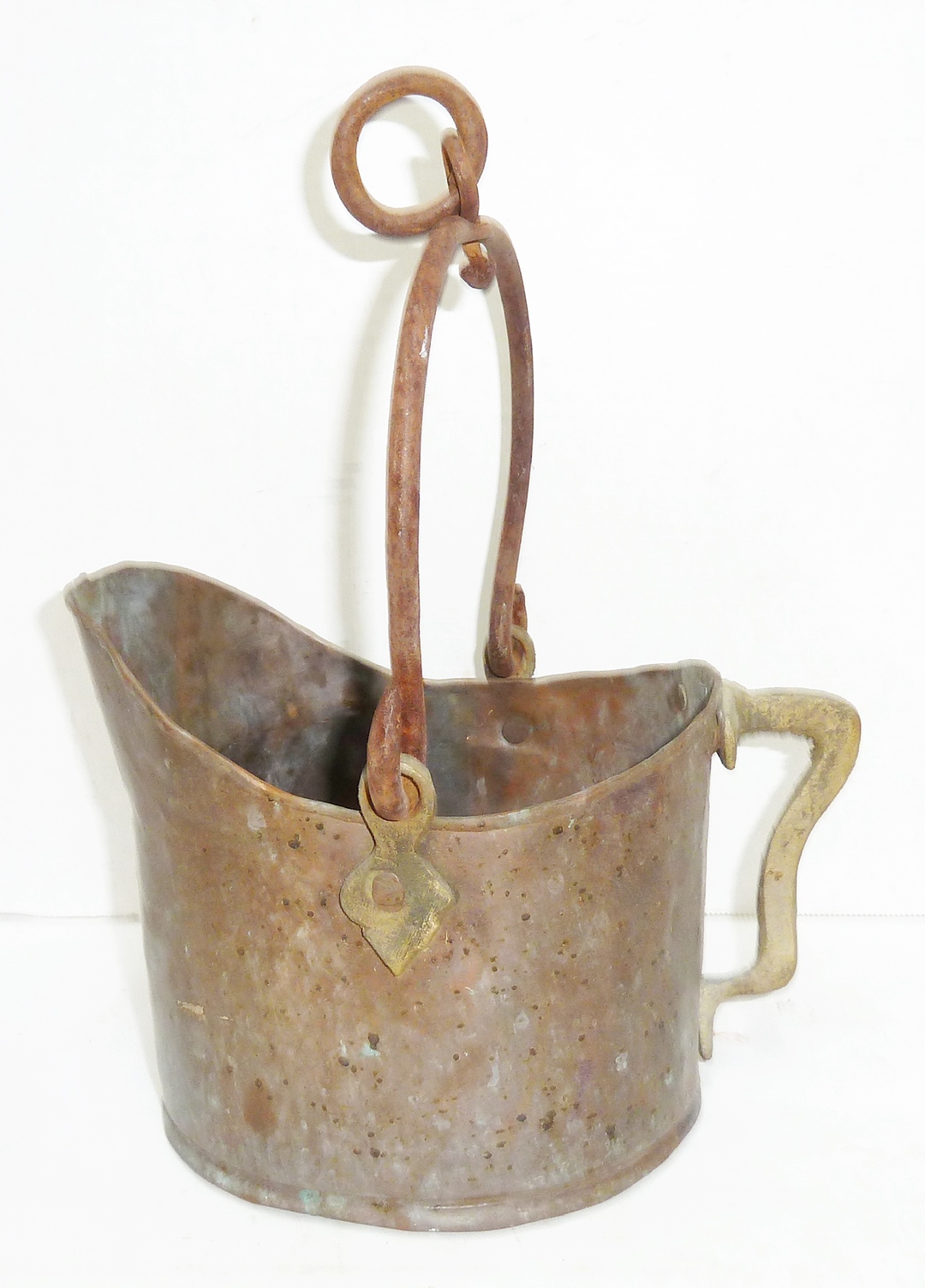SHIP OR PICKUP ~ Good looking antique copper coal scuttle bucket with brass accent handle and trims. Lovely piece to decorate your fireplace, lots of character on this one it's a beauty! Gorgeous patina coloring on the copper metal body, a fine piece to add to your primitive room.