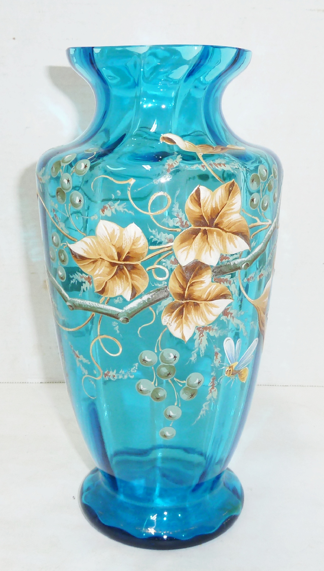 IN-HOUSE SHIPPING OR PICKUP AVAILABLE ~ This vase is striking when viewed in person, a late Victorian era art glass tall vase with enamel decorated leaf and vine designs. This vase catches the light beautifully with optic like panels swirls into the glass take a look it will be the highlight of your table or stand on display.
