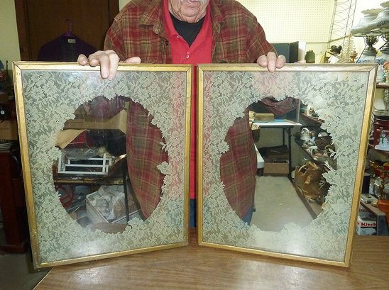 NO IN-HOUSE SHIPPING please pickup ~ Beautiful PAIR of matching vintage portrait frames, the glass having an etched lace design to accent the portrait you place in the frame. Good tight frames, no damage to glass, these are very interesting pieces to repurpose into something wonderful if you use your imagination! These would look lovely hanging on a chain in front of your windows for an elegant French Shabby decorator look. You can buy chain by the foot at Home Depot or other home goods stores and brass cup hooks to screw into the wood frame for hanging.